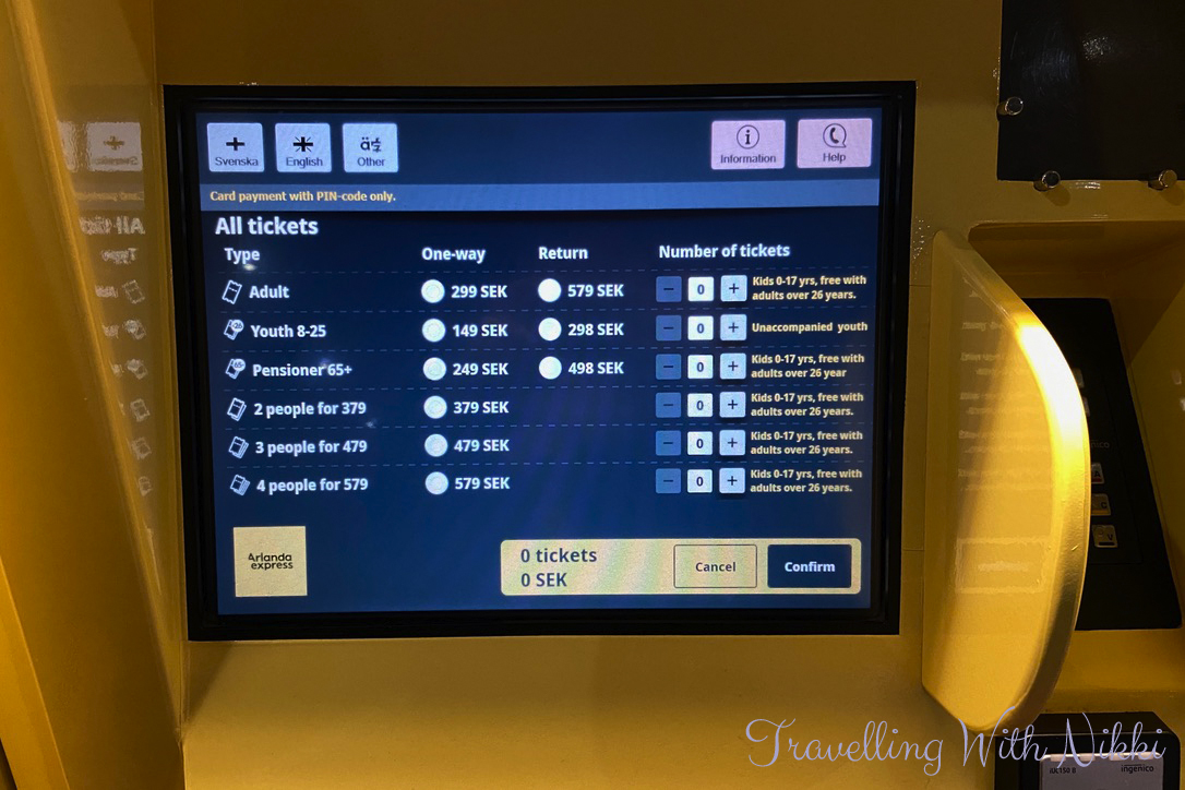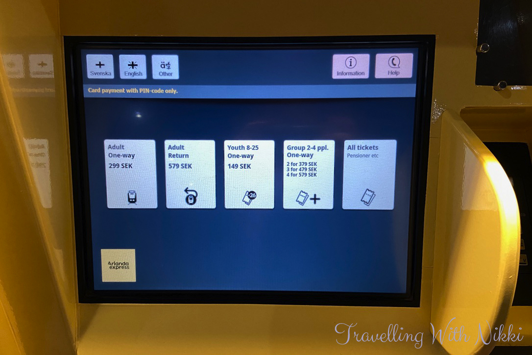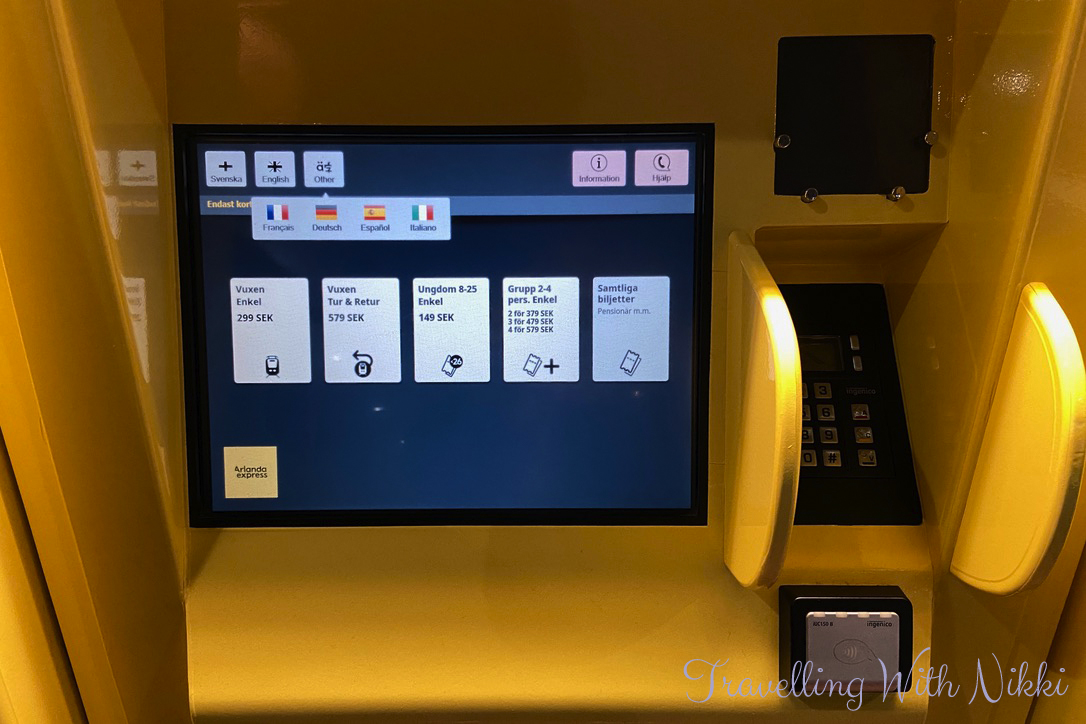 The ticket machines can be used in Swedish, English, French, German, Spanish and Italian. After selecting what language you need, all of the available ticket options are displayed on the screen. Do not wait until you are on the train itself to purchase your tickets as there is a 100 SEK surcharge per ticket if buying onboard.