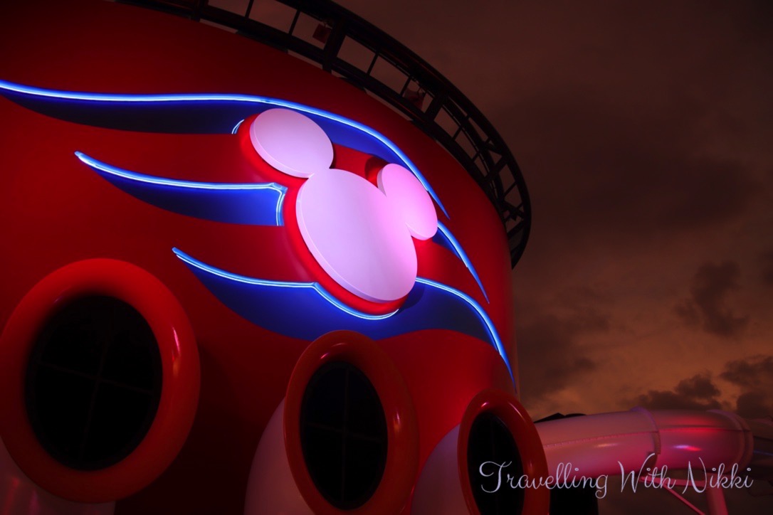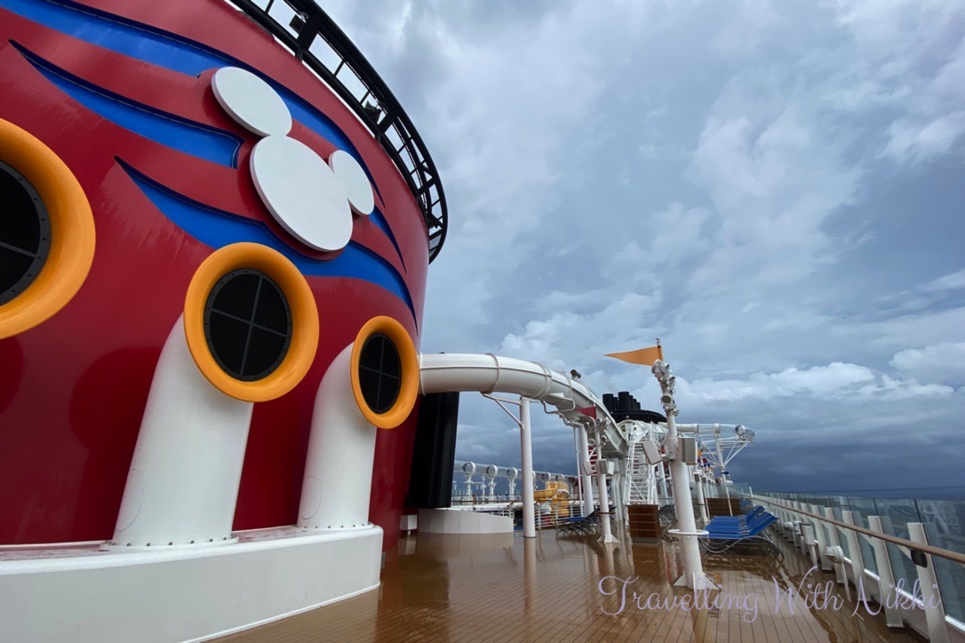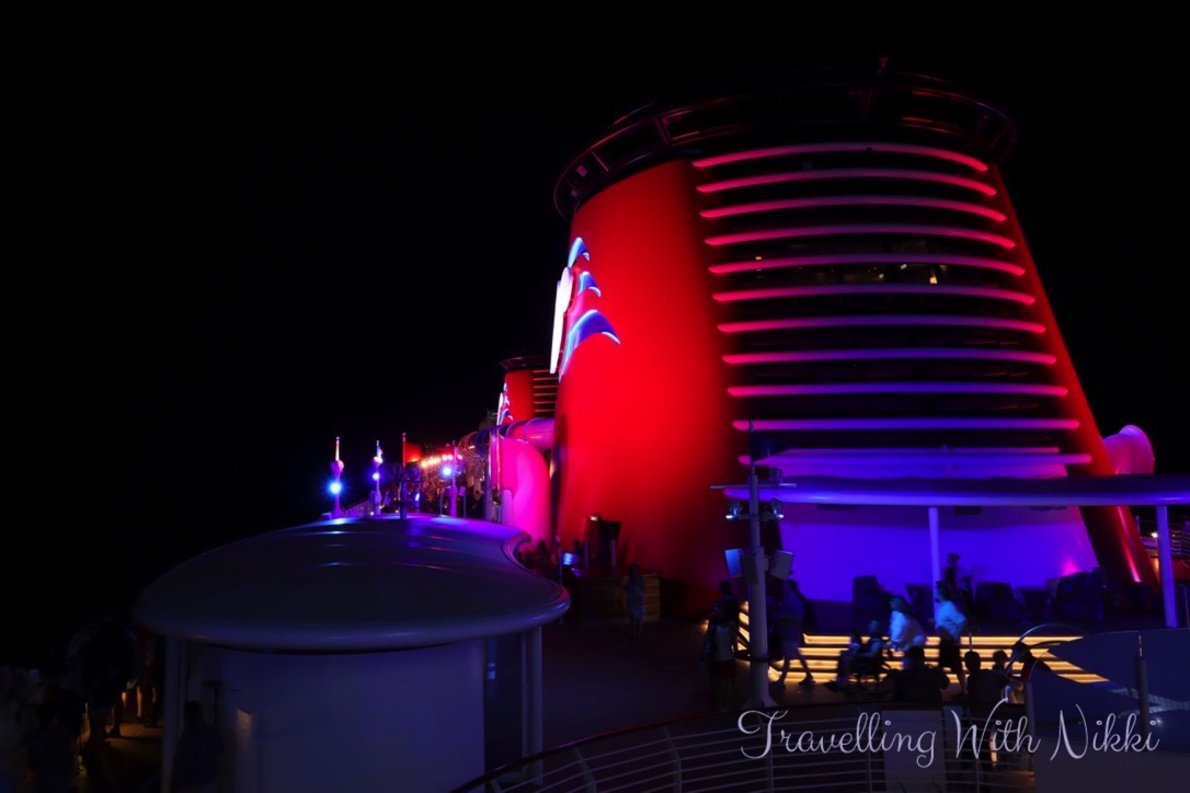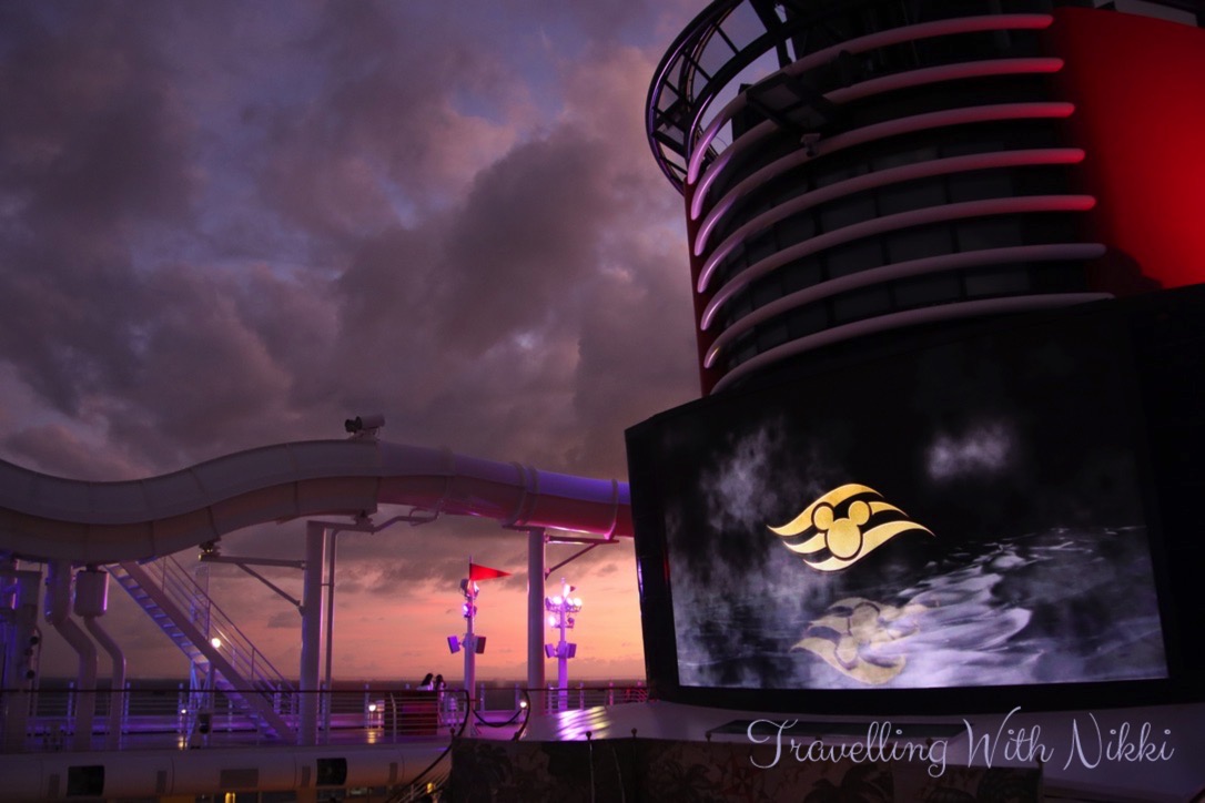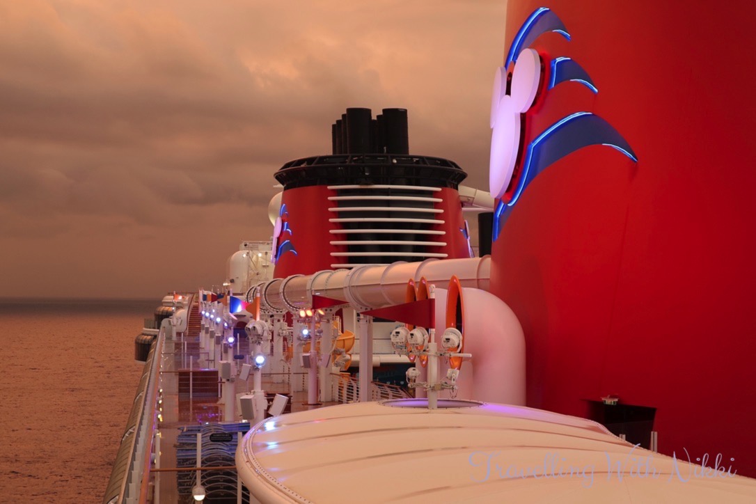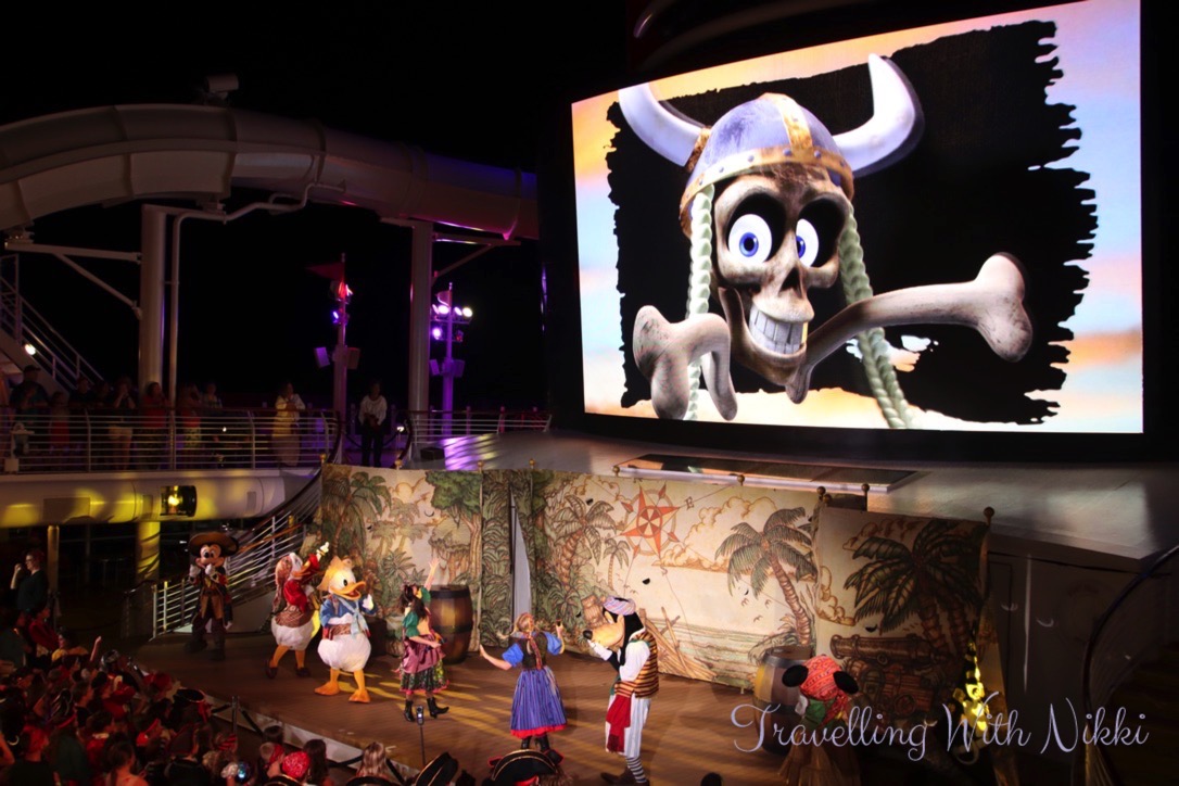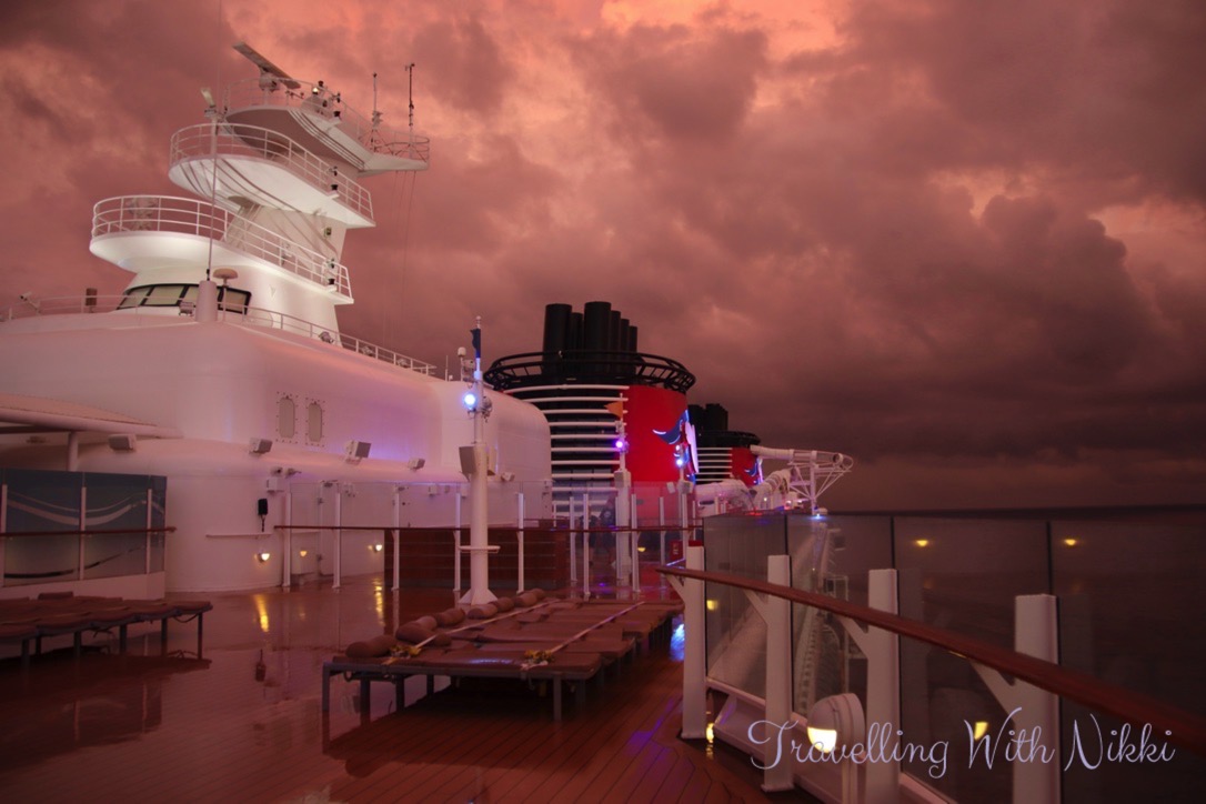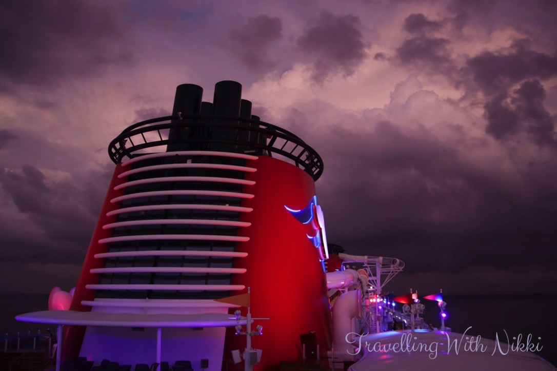 The amazing orange coloured sky quickly started to turn purple and if it is possible, it looked even more eerie than before but it was definitely turning out to be an absolutely perfect night for a pirate party! As we were walking around, we noticed that people were starting to turn up ready for Mickey’s Pirates IN the Caribbean so we grabbed a spot on Deck 12 to watch the show before it started to get busy. It was still very windy out but my top tip for anyone with long hair going on a Disney Cruise is to use the pirate bandana that is left for you in your stateroom as a hairband to keep your hair out of your face when out on deck!