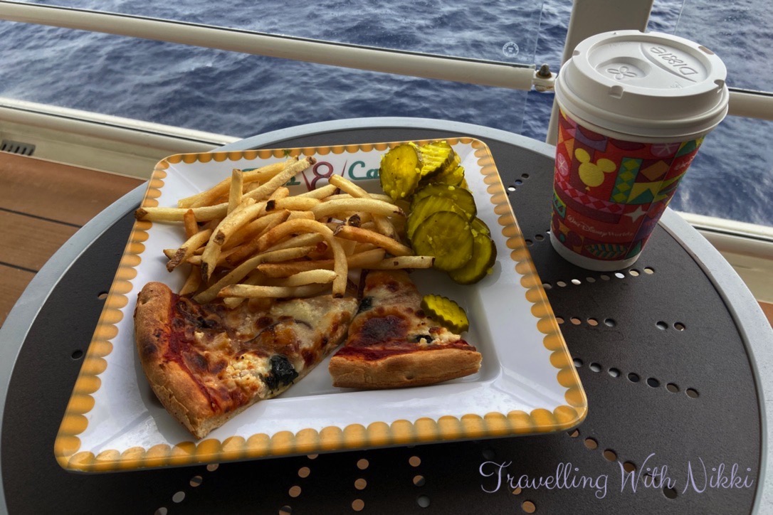 After leaving Pub 687 there were long lines already forming in the Lobby Atrium to meet the characters in their pirate outfits ready for Pirate Night that evening. We decided that we did not need to meet them on this cruise as we had been able to see them all in less than forty five minutes on our very quiet Hawaii cruise earlier this year on the Disney Wonder. As we were both still hungry after not eating much at lunchtime, we decided to get some pizza and fries from Flo’s Cafe which we took back to our stateroom to sit and eat on our verandah.