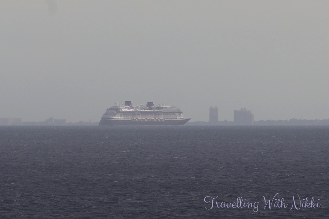 As we were eating our food, we noticed another ship with what looked like two funnels on the horizon in the distance so we grabbed a camera and quickly zoomed in and could not believe it when we saw that it was the Disney Wish sailing past Nassau. At one point we had considered booking that exact cruise and it would have definitely been interesting as their four night cruise turned into six nights due to Hurricane Ian closing Port Canaveral. It was so exciting as it was the first time we have ever seen her in person and I cannot wait to sail on her next year.