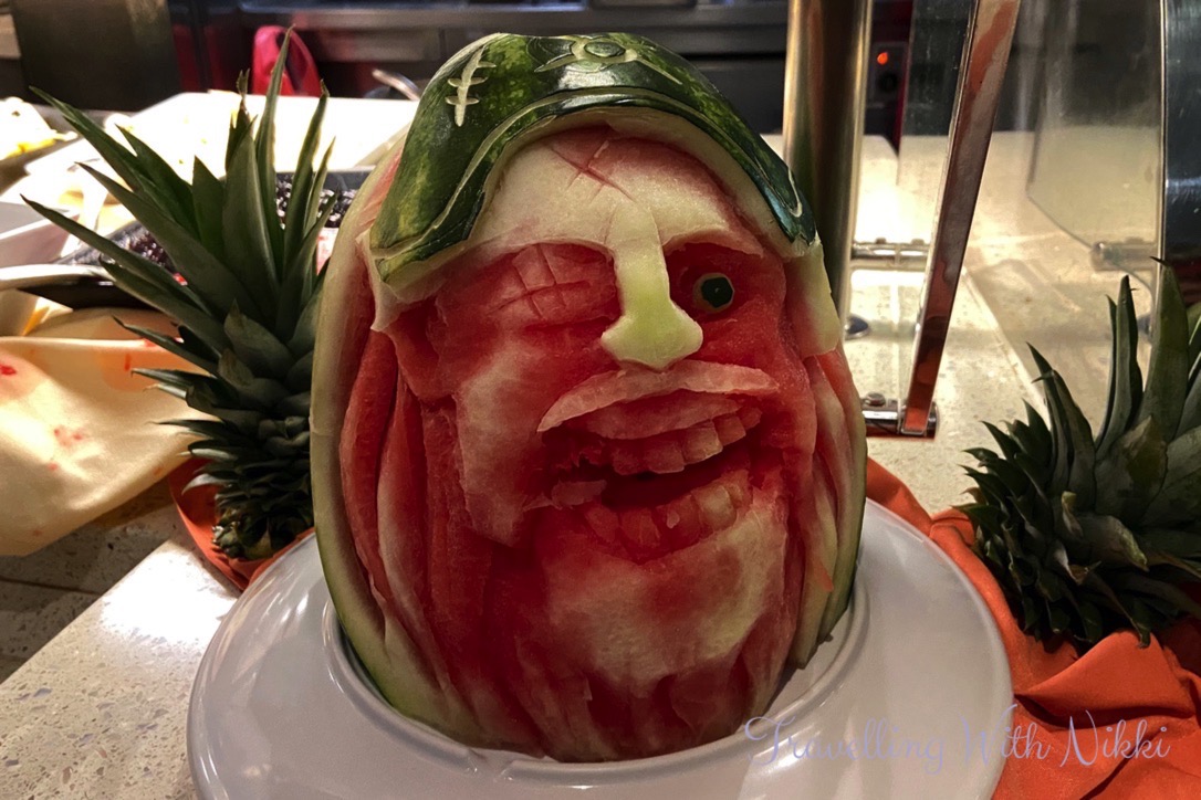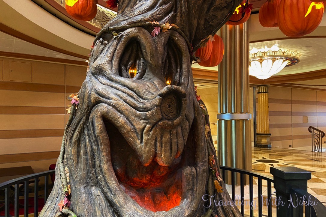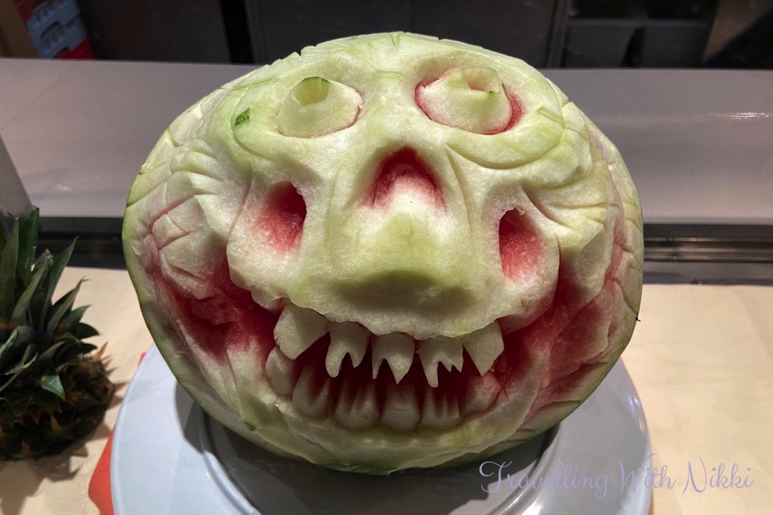 After getting dressed we walked down to a very quiet Lobby Atrium to take some photos of the Halloween decorations before making our way to Cabanas to get some breakfast and even though it was very busy in there, the atmosphere seemed very sombre when we arrived. I decided to order the Plant Based Scramble that can be made at the omelette station in Cabanas and this also came with some Plant Based Sausage Patties which were delicious – it was great to finally have something new to eat onboard.