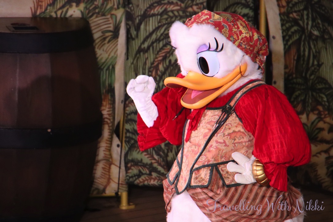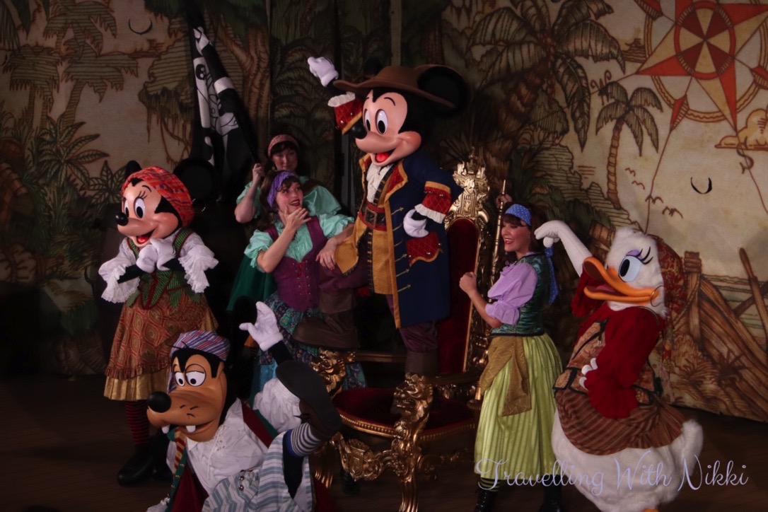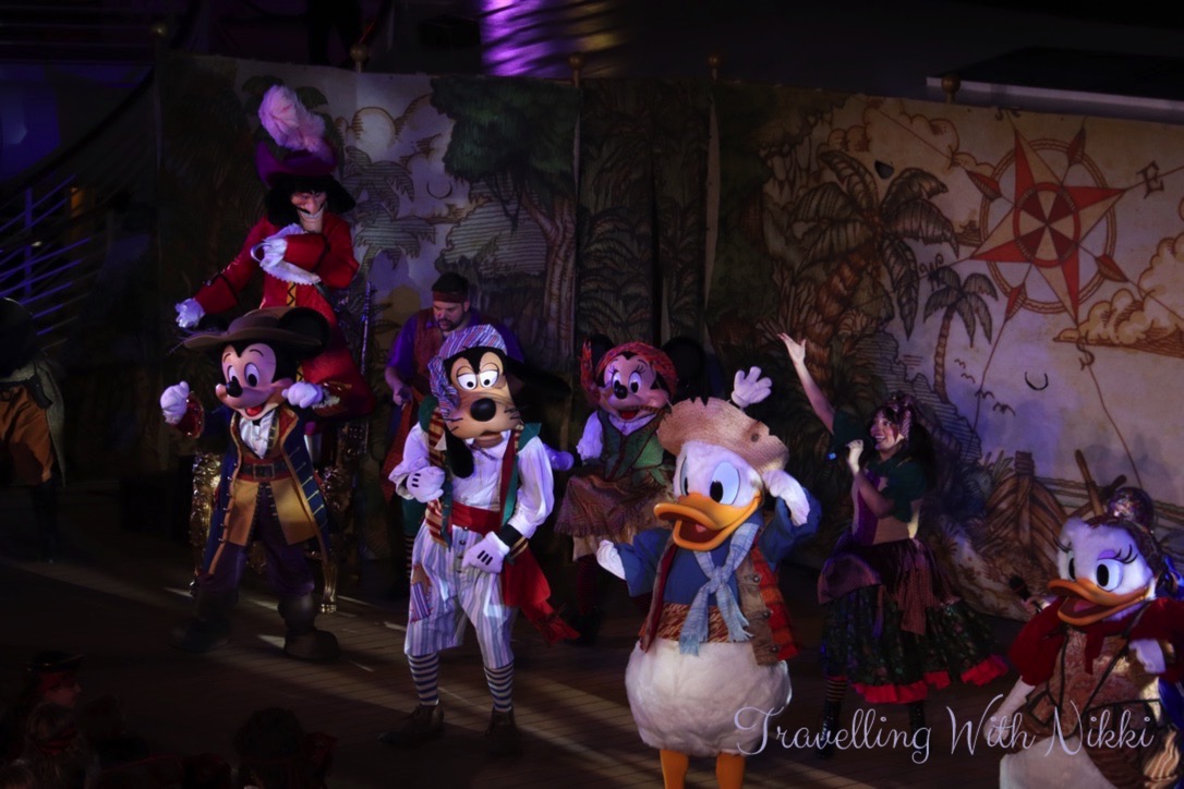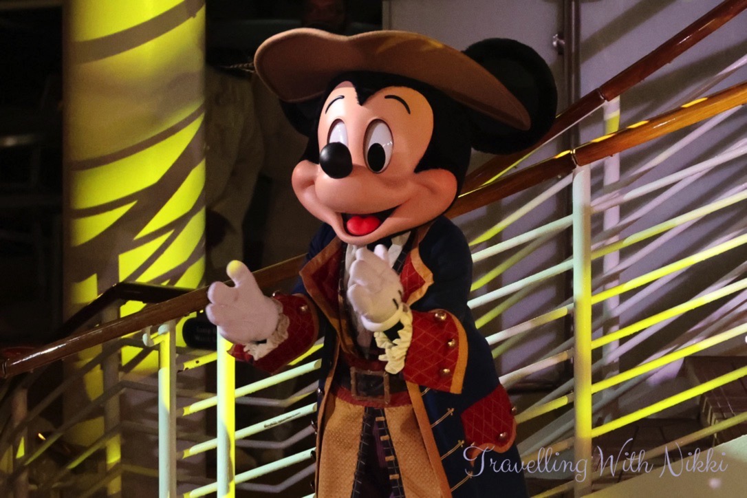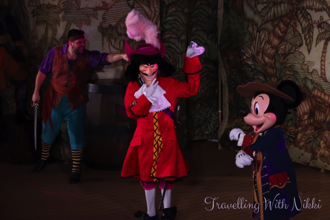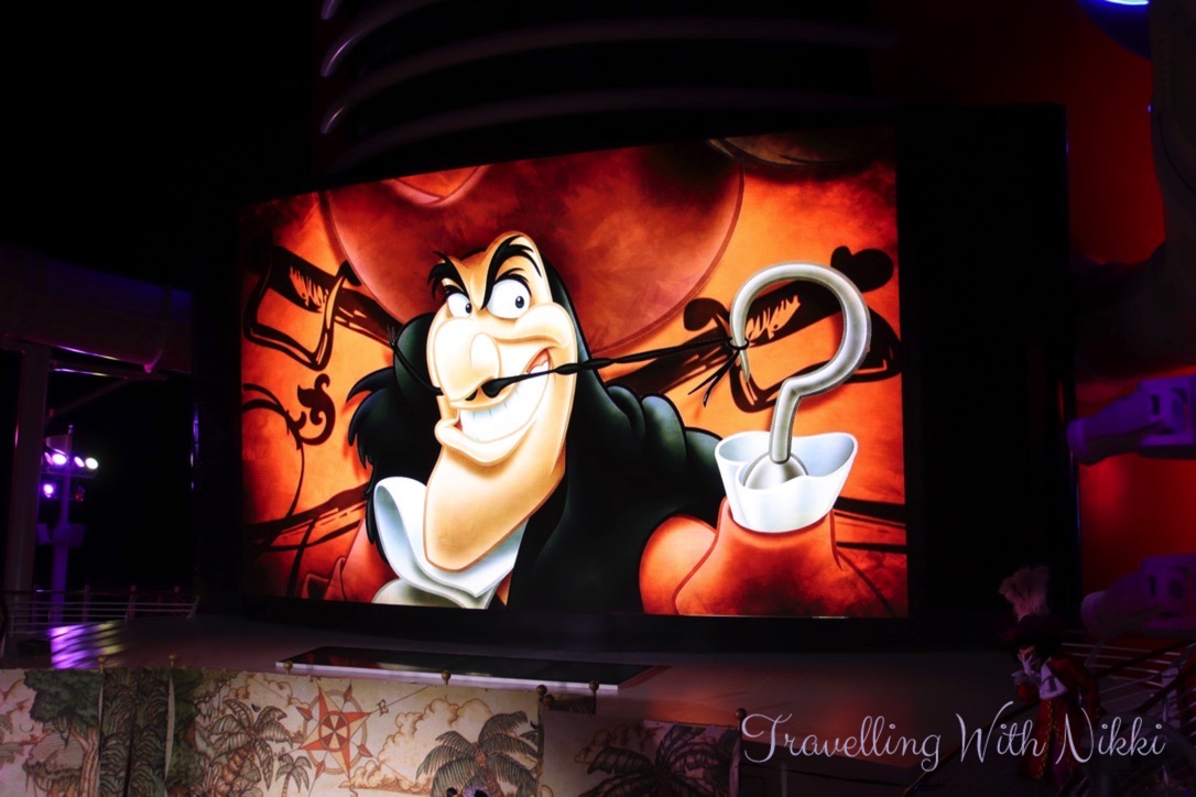 After a cannonball hits the Disney Dream, Captain Hook and Mr Smee arrive and take over the ship so Mickey challenges Hook to a “Captain’s Challenge”. If Captain Hook wins, Mickey has to walk the plank. And if Captain Mickey wins, he gets the ship back and Hook has to leave whilst everyone chants “Hook is a codfish!”