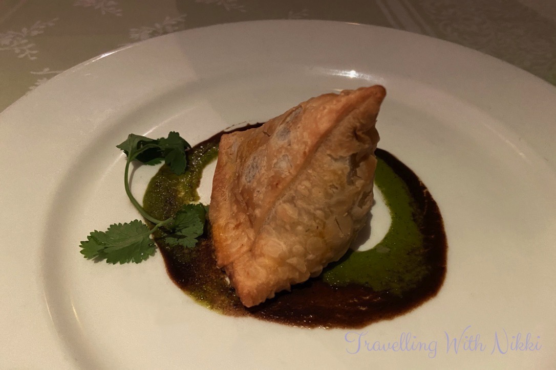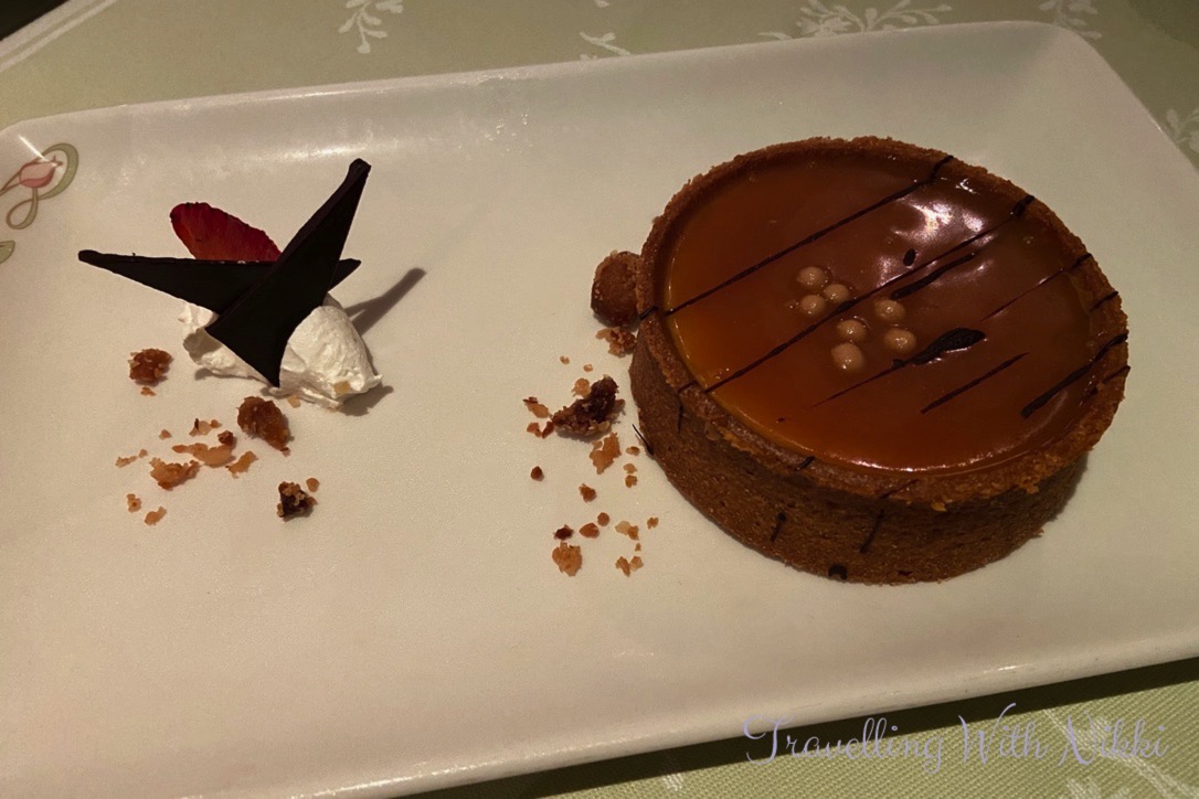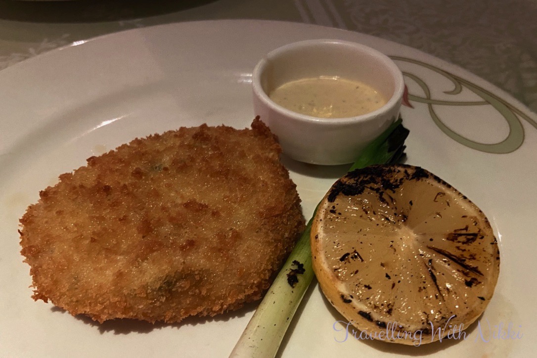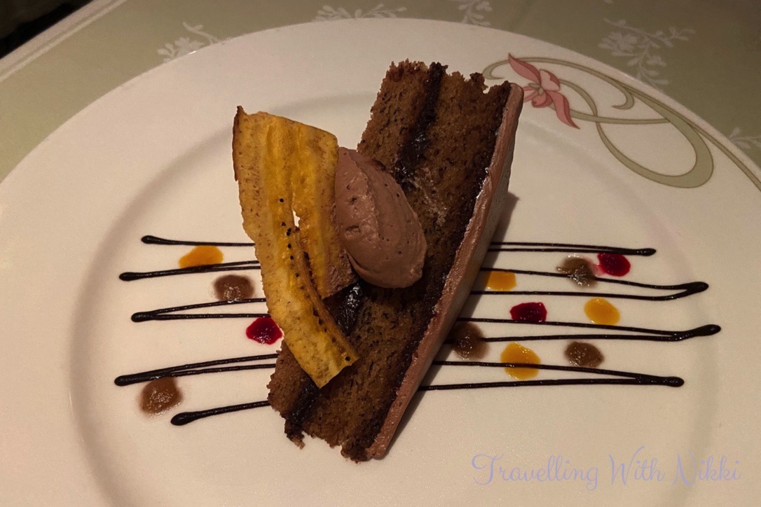 Following the ship’s successful return to Captain Mickey and his pirate crew, we headed down to Enchanted Garden on Deck 2 at 8:15pm for our dinner. As the Pirate Night menu onboard is not the best (although it is a lot better than it used to be) I had the Sri Sumbhajee’s Vegetable Samosa and the Deep Fried Calypso Crab Cake to start before having the amazing albeit incredibly sweet Caramel Macadamia Nut Cheesecake Tart (as well as the Bananas in Paradise to share) for dessert.