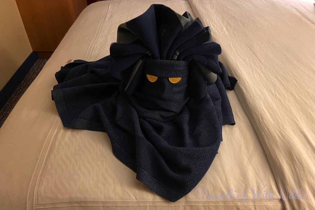 We took our desserts as well as a cold drink back to our stateroom where a Davy Jones blanket creation was waiting on the bed for us along with some gold chocolate coins. It really did not take long to fall asleep on this night – I only wish I could fall asleep at home as quickly as I seem to do onboard a cruise ship!
