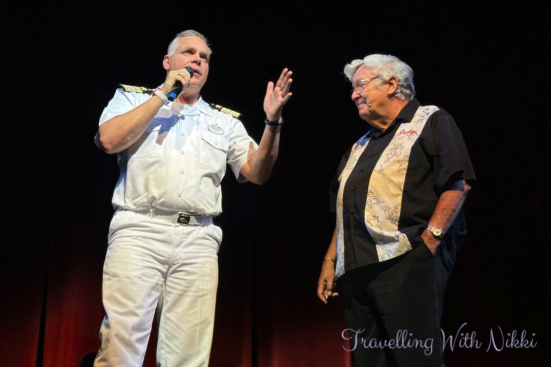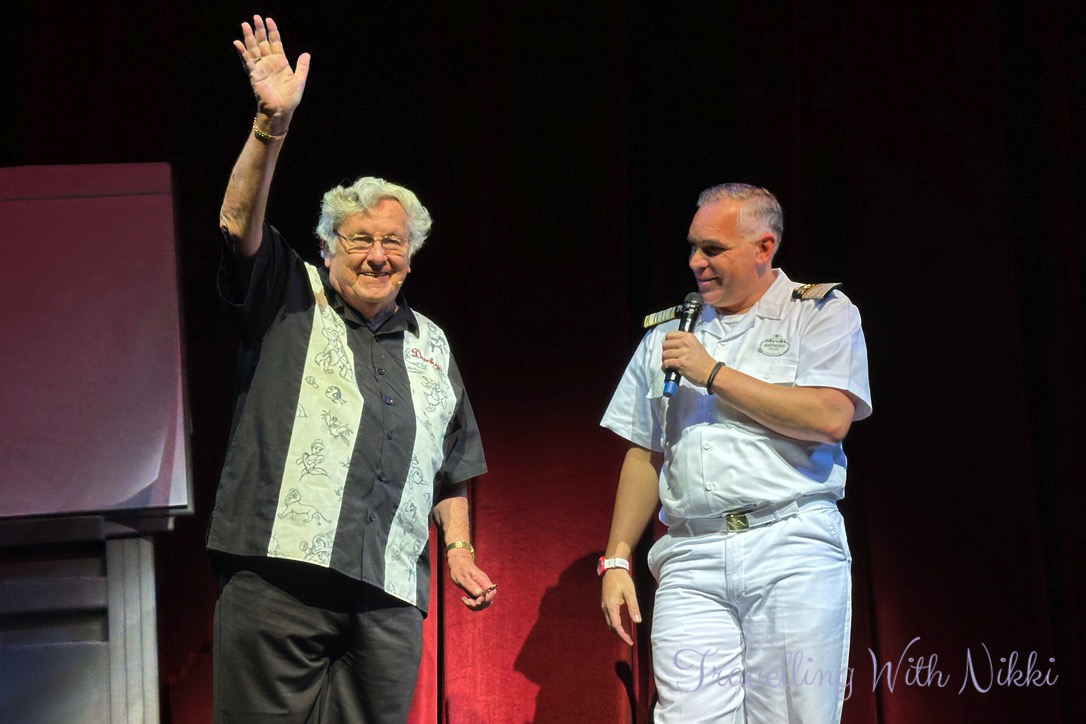 Once the theatre was open we managed to get two seats close to the stage and our Cruise Director Anthony started proceedings by telling us there was 550 Gold Castaway Club members onboard, 502 Platinum and 131 Pearl and there was also someone onboard who had sailed with Disney Cruise Line 114 times.