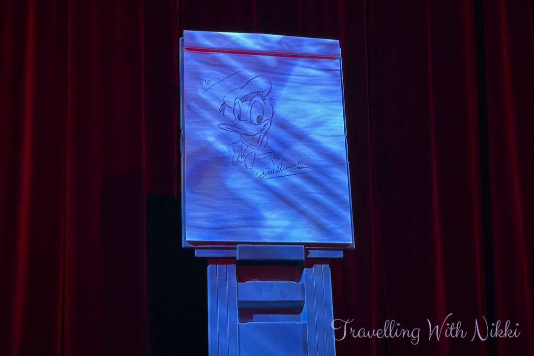 At these receptions they usually show you a behind the scenes look at one of the shows onboard but Anthony said that they decided to mix things up on this cruise so instead we had an exclusive presentation from Don “Ducky” Williams – the famous Disney illustrator whose drawings you will see everywhere throughout the different Disney parks, resorts and cruise ships – who drew his favourite character of Donald Duck whilst being interviewed by Anthony. I loved listening to his story of when he wrote to Walt Disney when he was ten years old to ask for a job and actually received a reply from the man himself saying that they didn’t have any jobs at that time but to make sure to keep practicing his drawing.