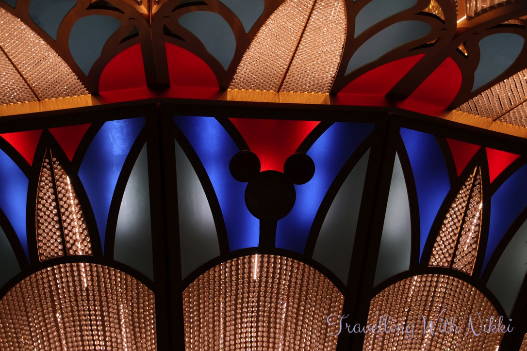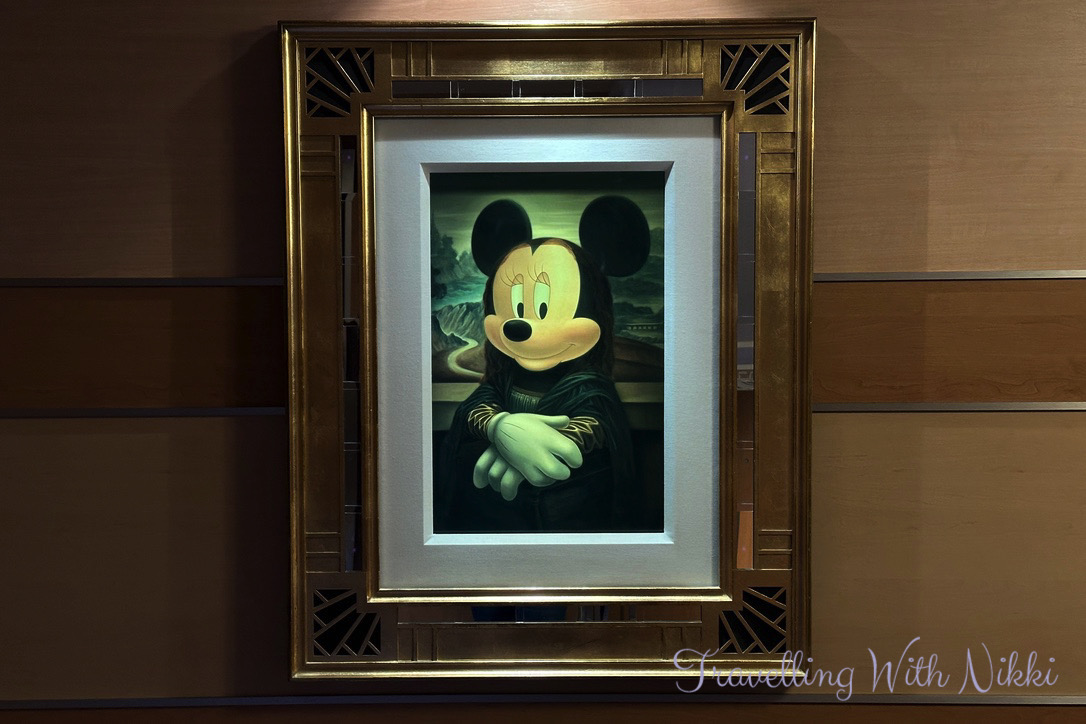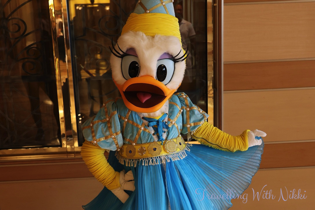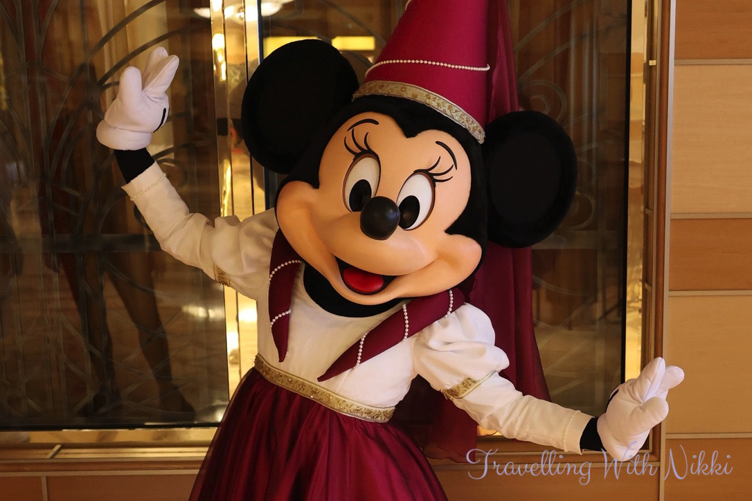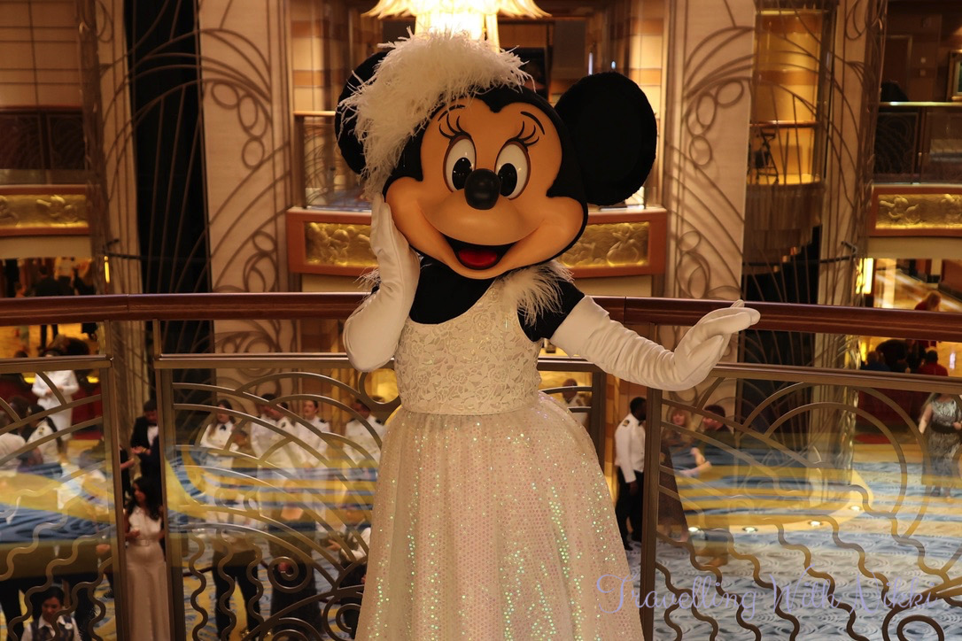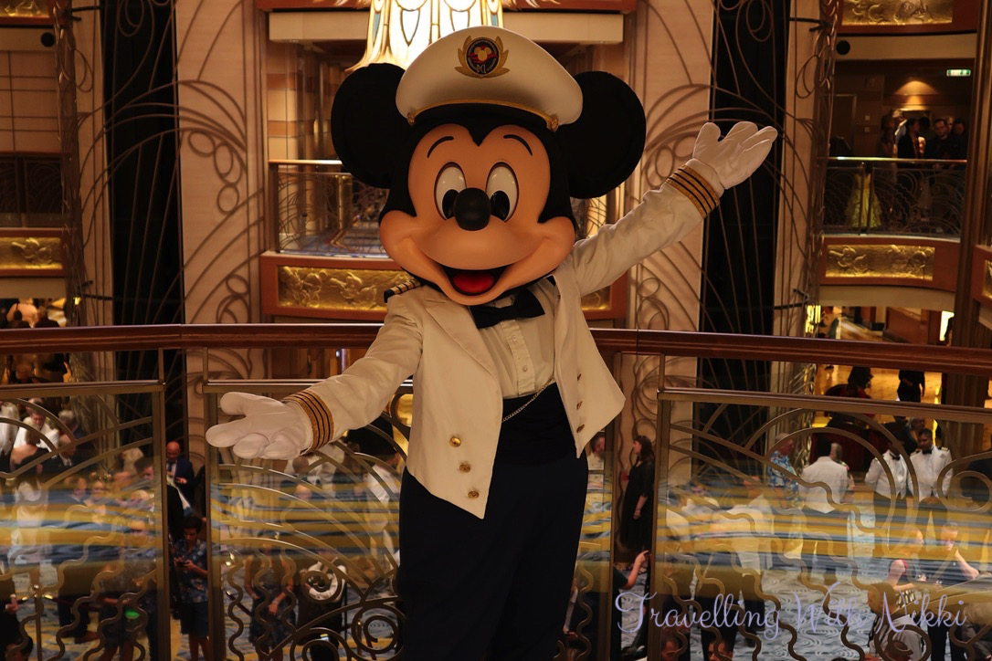 After relaxing by the pool and a freezing cold ride on the Aquaduck, we headed back to our stateroom for a hot shower to warm up and get ready for our evening onboard. The lobby atrium was very busy as it was the Captain’s Welcome Reception and complimentary alcoholic drinks including wine and cocktails were on offer. Even though there was a long line to meet Mickey in his formal Captain’s outfit, we decided to join it and once we had met him, we rejoined the line once again to meet Minnie.