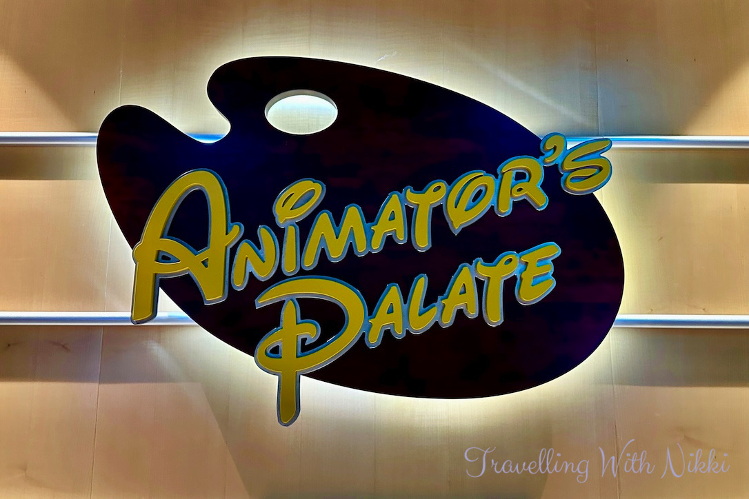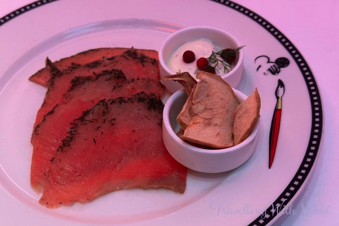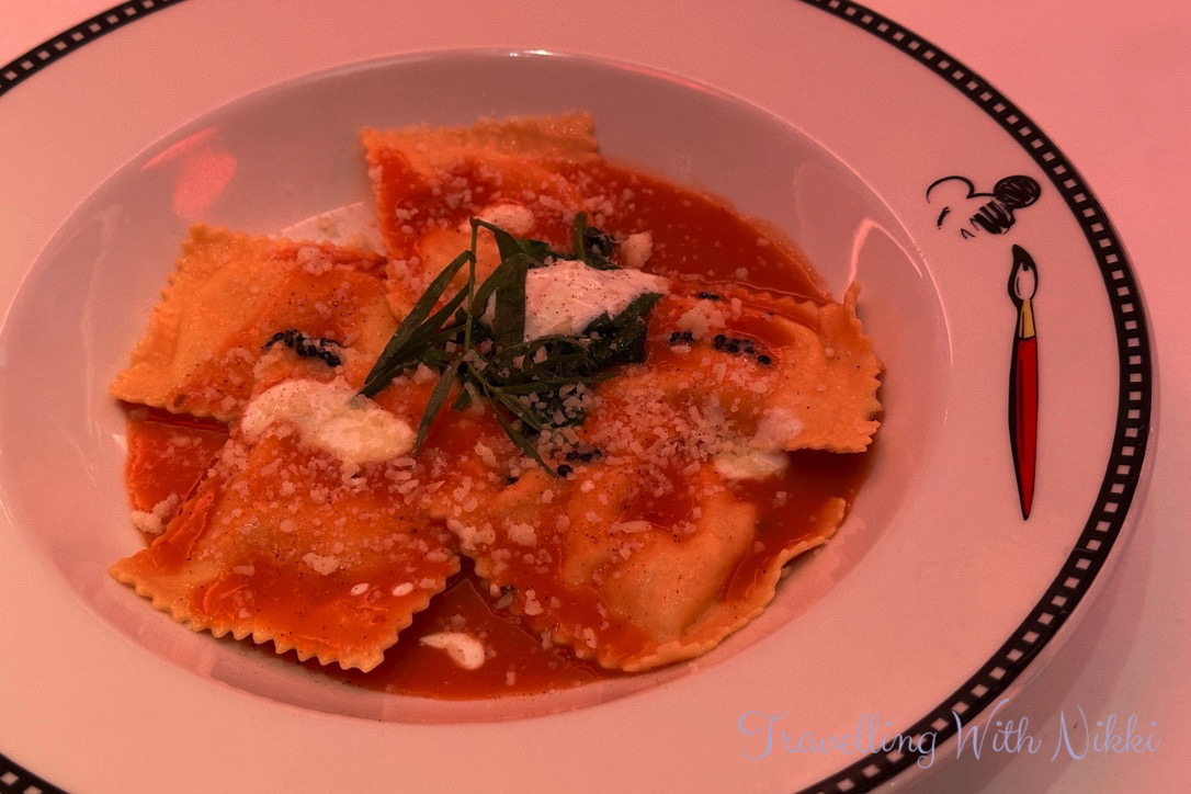 After meeting Minnie we walked straight to Animator’s Palate for our dinner and every restaurant on this evening was serving the Freezing the Night Away Menu. I ordered the Arendelle Gravlax and the delicious Sven’s Carrot Soup to start followed by the Lobster Ravioli for my main course. There was no show that night in Animator’s Palate but all of the screens around the restaurant showed different Disney artwork instead.