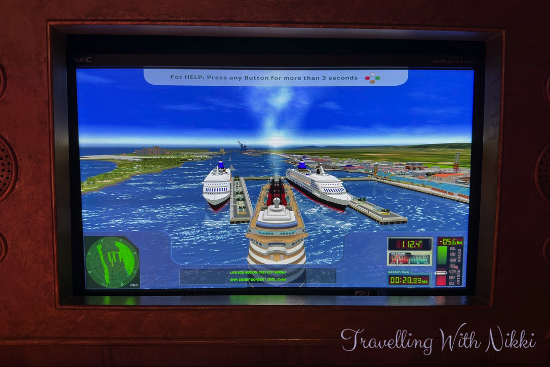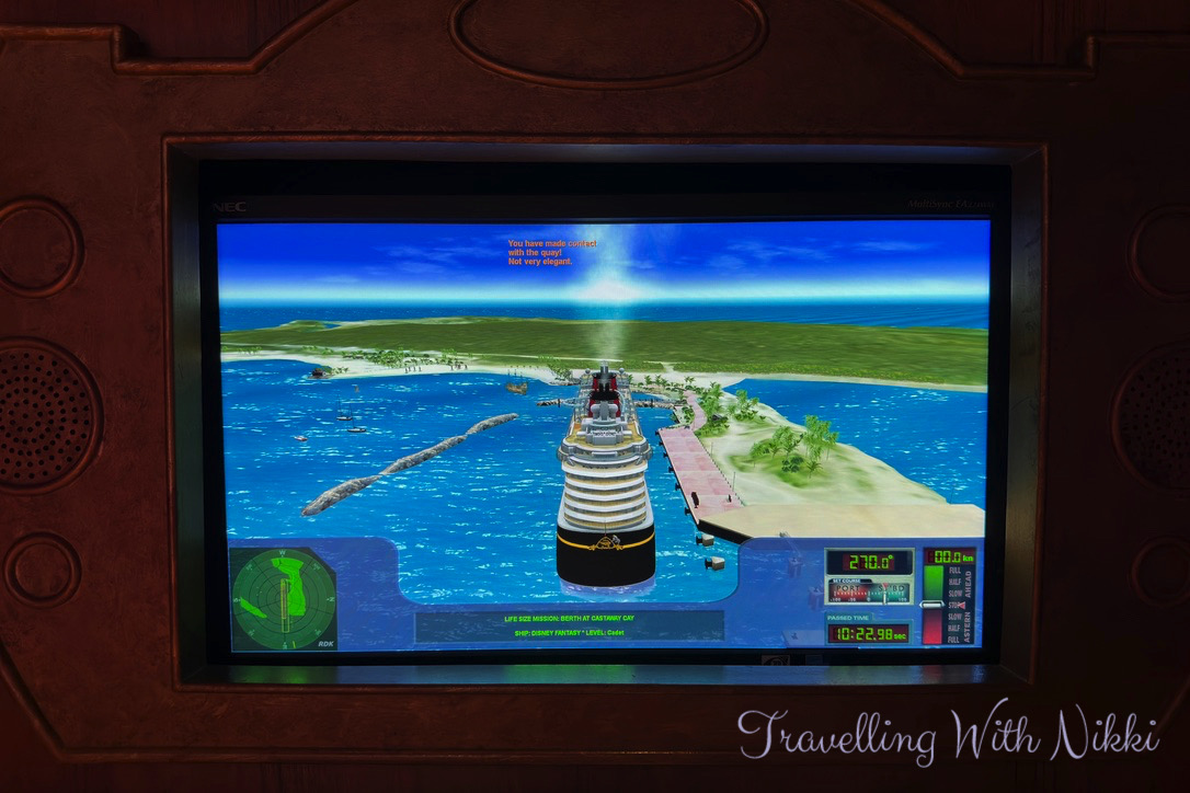 After spending way too much time messing around on the amazing Magic Dancefloor, we then played on the navigation simulators in the “Explorer’s Room” where you can attempt to dock and undock the ship at various ports such as Castaway Cay and Nassau. Also at this time Stitch made a quick appearance as many of the adults were learning how to make Space Goo in another area of the Lab.