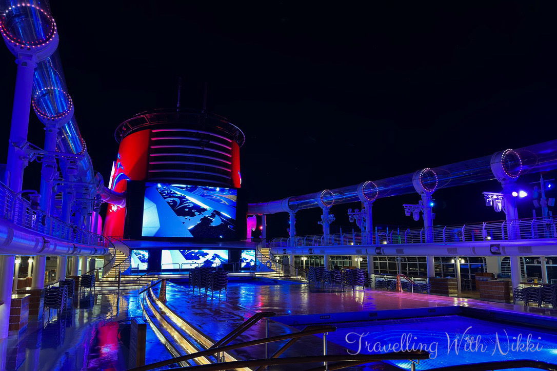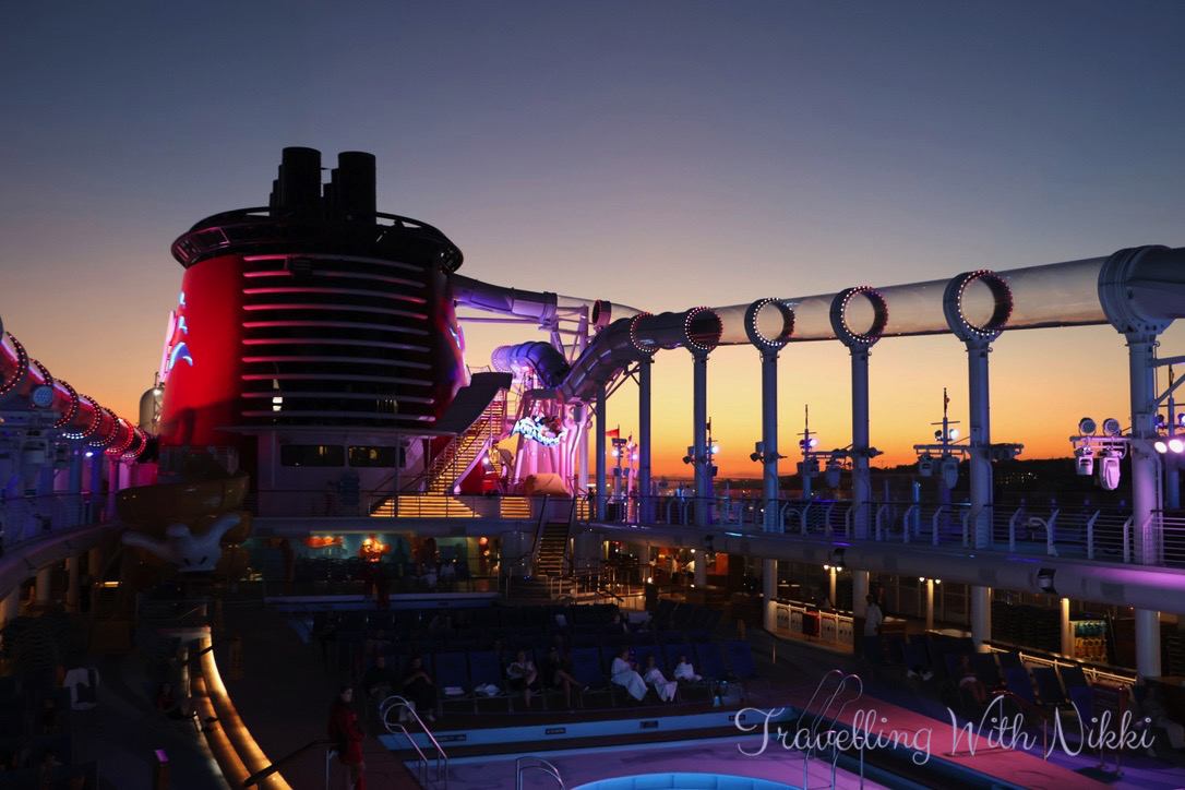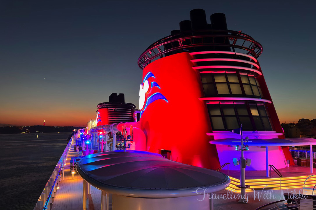 We were back onboard the Disney Dream just before 3:00pm and the first thing we did was change into our bathing suits as we needed some time by the pool to cool down after walking around Lisbon. We were both still a little hungry so I got a plant based hot dog and fries from Tow Mater’s Grill along with a cold drink. However we struggled to find anywhere to sit in the Quiet Cove but we eventually found some chairs in the area in front of Satellite Falls on Deck 13 where we ate our food in peace and quiet looking out over Lisbon in front of us.