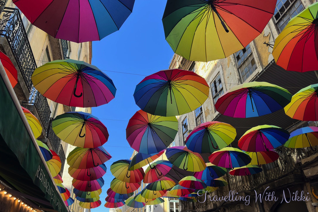From here we walked down the street where the Elevador Da Glória funicular usually runs (it was not operating that day) to the Praça dos Restauradores. We then took a slow walk back through Chiado towards Pink Street (which is covered in colourful umbrellas) and then on to the Time Out Market which is located on the waterfront in the Cais do Sodre neighbourhood.