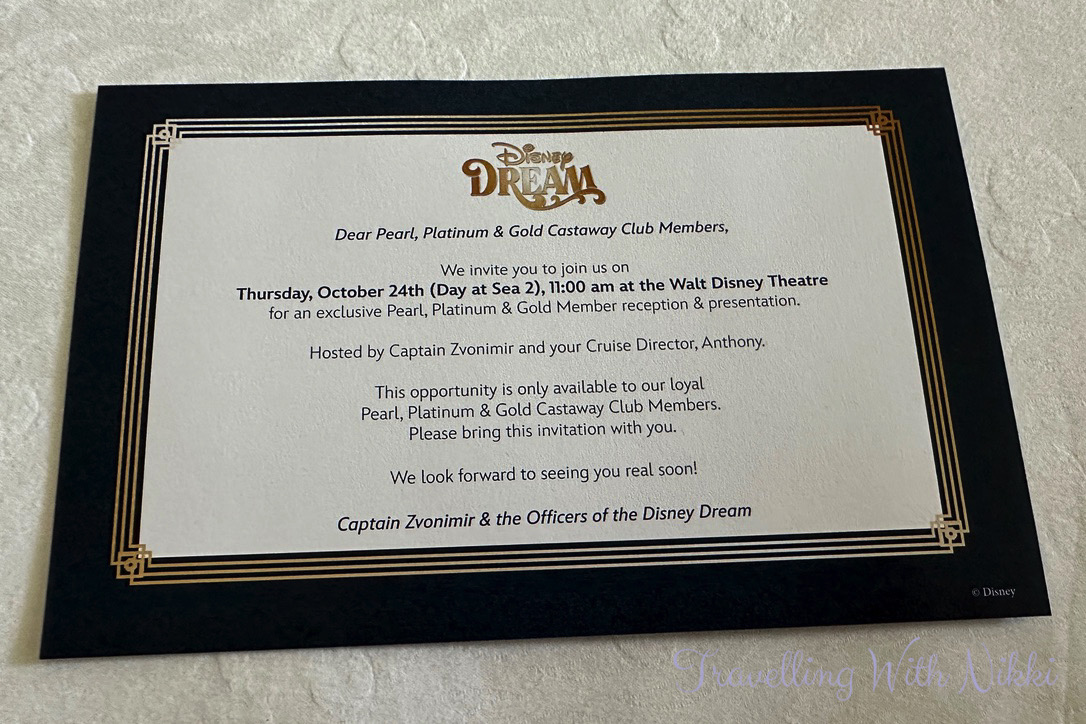 After cooling off in the Quiet Cove Pool – sadly the Aquaduck was not running that afternoon – we made our way back to our stateroom where we saw an invite waiting for us on the bed for the Gold, Platinum and Pearl Castaway Club Onboard Reception that would be taking place the following morning in the Walt Disney Theatre – this would be our second time attending one of these events as they only happen on cruises that are eight nights or longer.