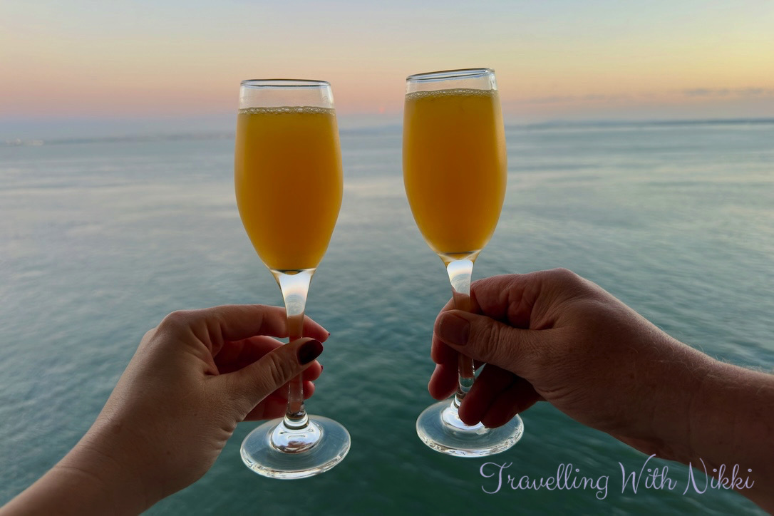Once we got back up to our stateroom, we made a Mimosa each using our complimentary bottle of Prosecco from being Platinum Castaway Club members and some nice orange juice that we had bought the day before in Vigo and sat on our verandah and watched as the sun started to set over Lisbon.