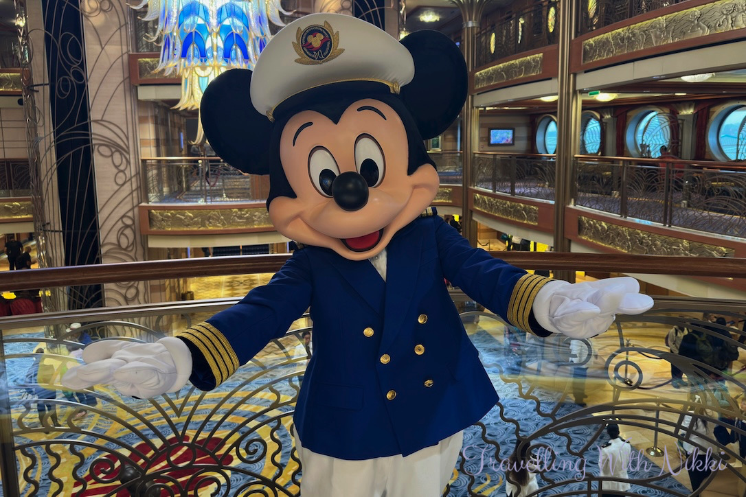 Just after 12:30pm our names were finally announced as we boarded the Disney Dream for our fourth cruise on her making her our most cruised ship. The brand new carpets onboard in the Lobby Atrium instantly gave us an extra spring in our step (they were so bouncy!) and we quickly ran up to the Deck 4 balcony when we saw that Captain Mickey was out. He only had one other person waiting to meet him and after a much-needed hug and a quick selfie, the world was a happy place once again and our cruise could finally begin.