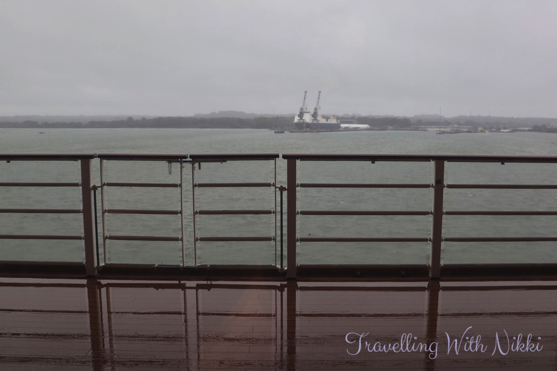 Unlike the beautiful weather on the previous day in Southampton, the forecast for embarkation day was awful as Storm Ashley had arrived in the UK bringing heavy rain and strong winds with it. However in a weird way this just made me smile as every time that we board the Disney Dream, we always have some form of bad weather on the day (whether it be a thunderstorm or even a hurricane on the way) so it really just feels “normal” at this point – you can either laugh or cry at a situation like this and I prefer to look on the bright side of things. However I was also keeping my fingers crossed that we would still get an outdoor sailaway party later that day as the forecast was showing that the rain would stop mid-afternoon.