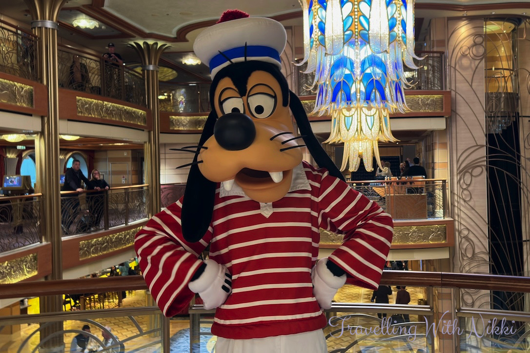 As we walked back up the stairs towards the Lobby Atrium we saw Goofy out on Deck 4 all by himself so of course we had to go and say hello! We also walked past Mickey’s Mainsail and Sea Treasures to look through the windows at what merchandise was available and spotted a few things that we wanted to come back and buy when they opened later that evening.