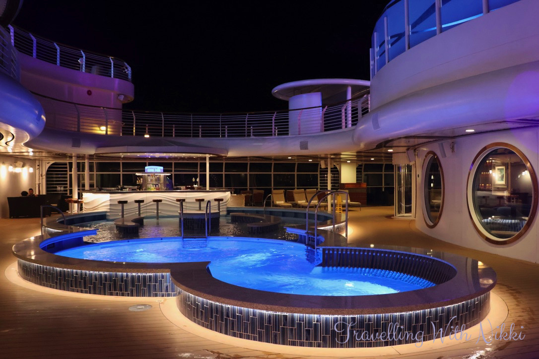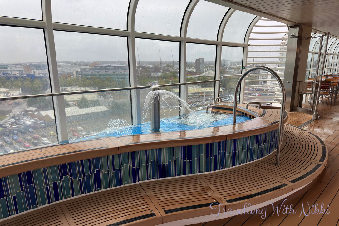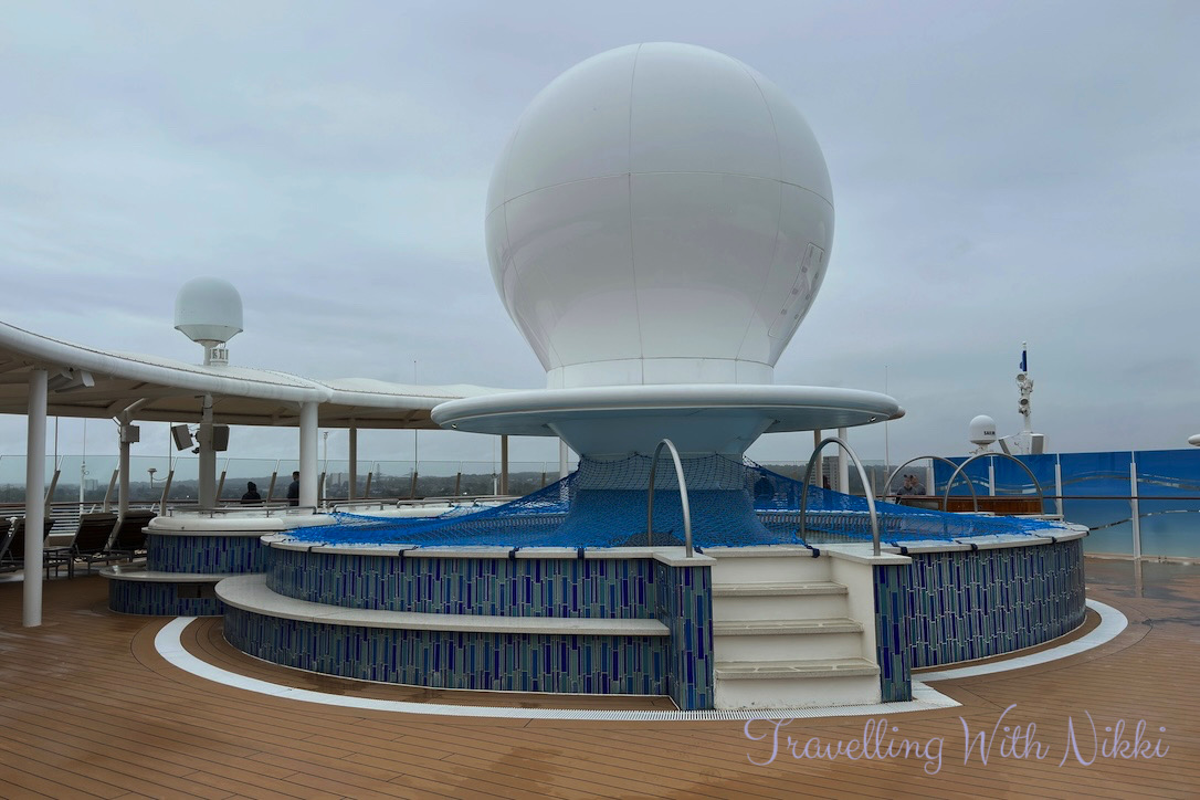 We took the elevator up to Decks 12 and 13 to see what other changes had been made in dry dock and thankfully it had stopped raining as the forecast had said and the decks were starting to dry out and they were even stacking the deck chairs away ready for the sailaway party. We were very pleased to see Satellite Falls which I know is a favourite area to many onboard (us included) was still intact and it looks the same however you can now only access it from the port side of Deck 13 as the Concierge sundeck has been expanded out onto the starboard side of the deck.