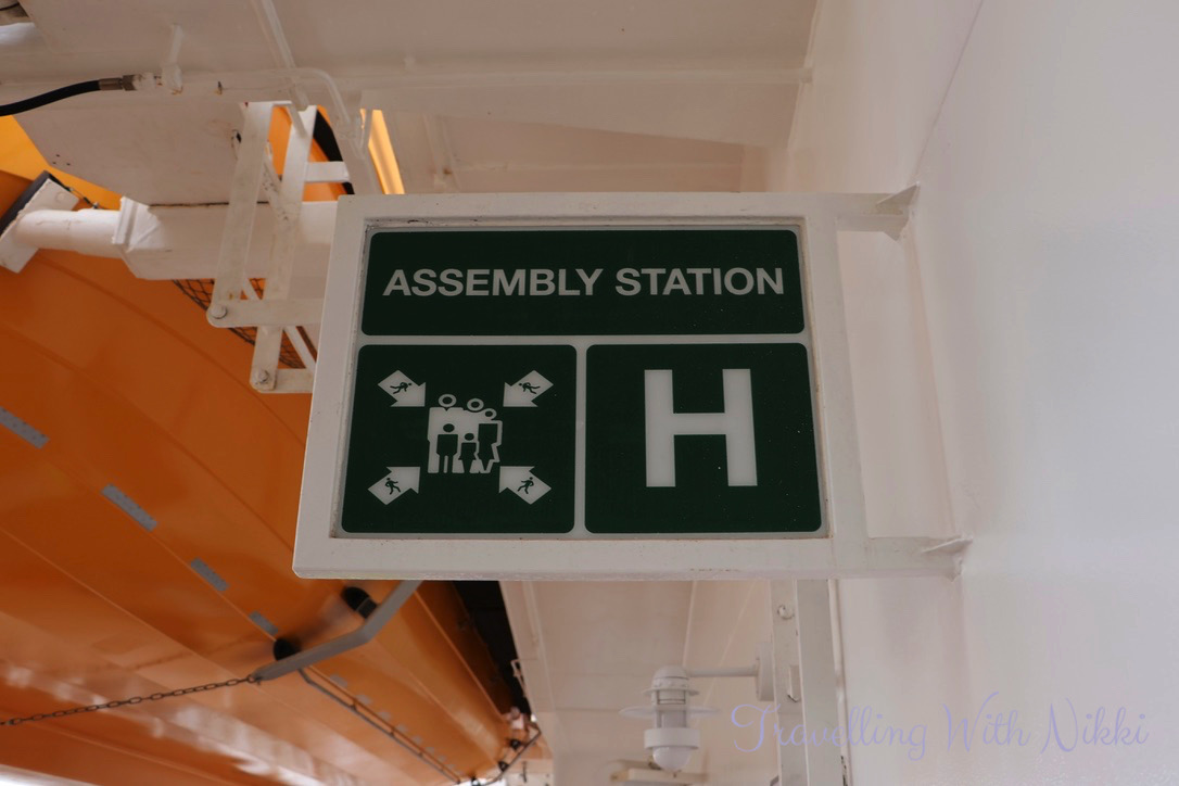 Our Muster Station was “H” which was located outside on Deck 4 and we made our way there about fifteen minutes before it was due to start as it is not something that you ever want to be late for. We also stopped back at our stateroom on the way there to collect anything that we needed for the sailaway party so we could go straight there once the emergency drill was over.