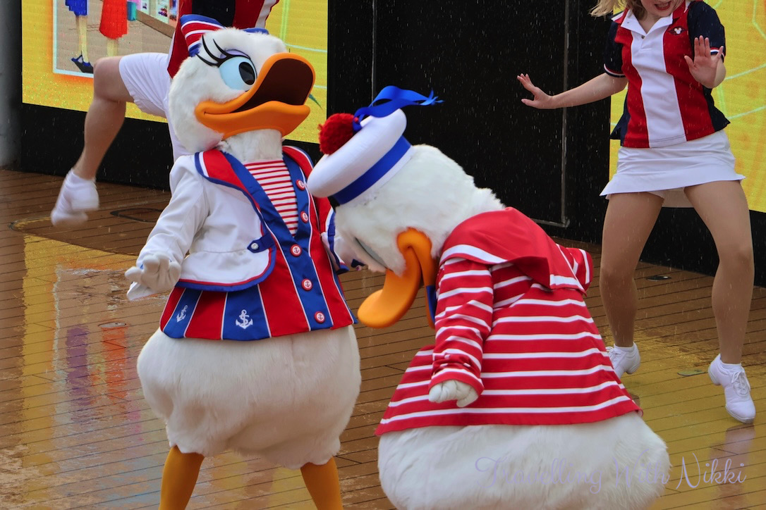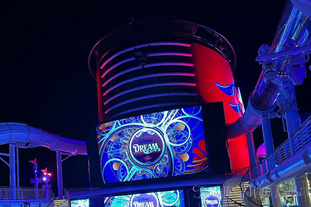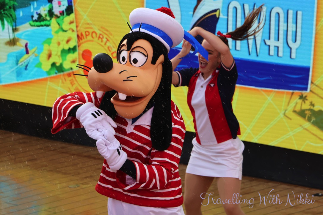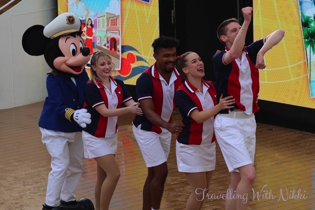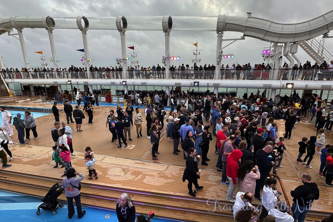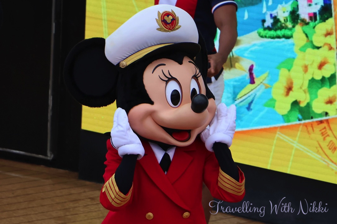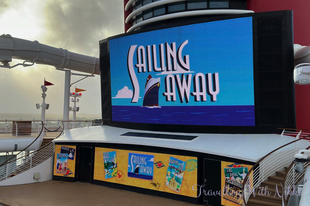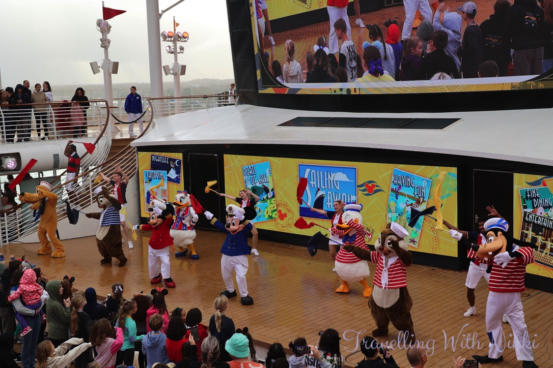 I had no issues getting one of my favourite spots on Deck 12 and more blue skies were slowly appearing which felt so good given the heavy rain all morning as I really thought that the party would be moved indoors to the Lobby Atrium which happened to us on our first cruise on the Dream in 2016. Another change to the Disney Dream during dry dock was the addition of the giant screens behind the stage similar to what is onboard the Disney Wish and the Disney Treasure which looked so much better than the backdrops that they used to put up for each event.