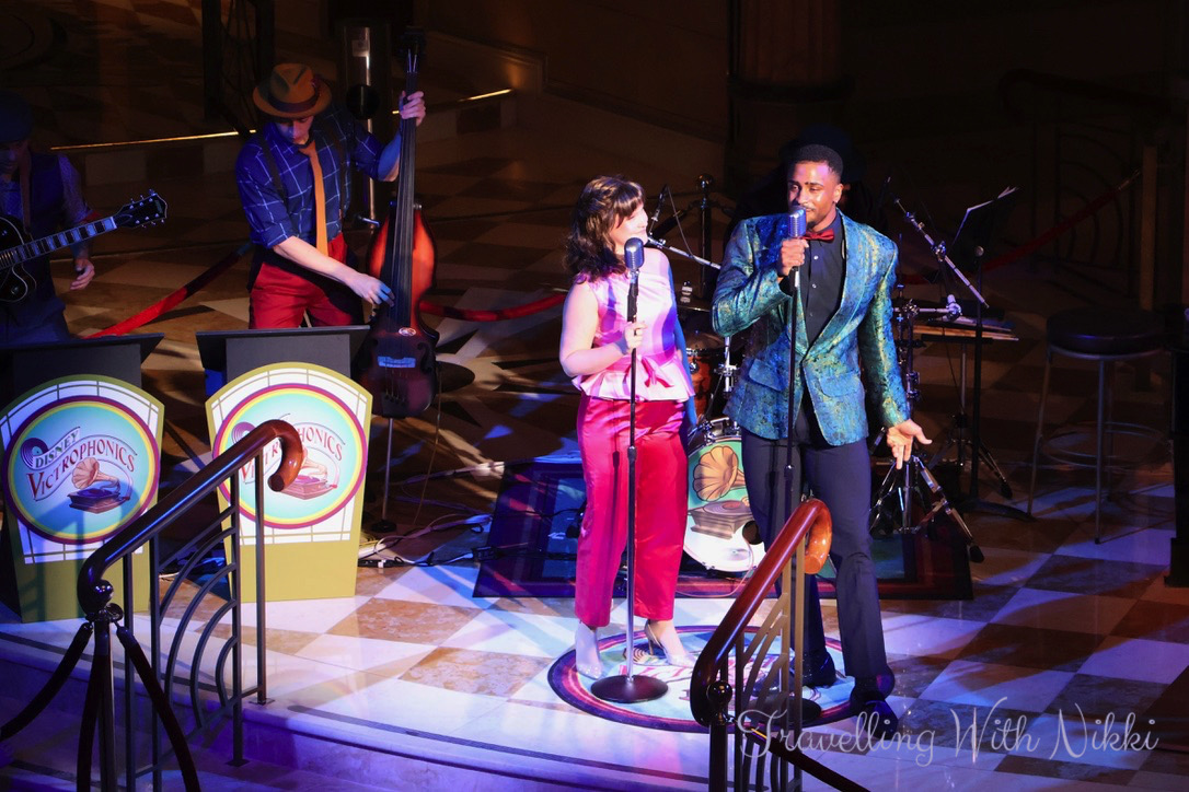 There was no show playing in the Walt Disney Theatre on the first night of our cruise but we did watch the Disney Victrophonics in the Lobby Atrium before dinner (they also had a later show that night as well) who who sing jazz versions of different Disney songs. There were also characters out absolutely everywhere that you looked (both as official meet and greets as well as roaming around) but we did not wait to meet any of them on this night as we figured that we had the next two weeks to do that instead!
