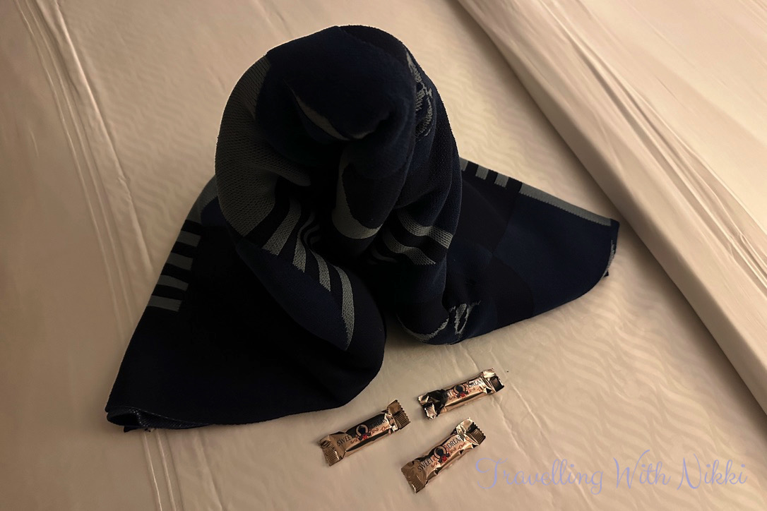 Our first blanket creation of the cruise was waiting on the bed for us and it felt heavenly to change into my pyjamas and sit in bed. It was 9:30pm and the chilled end to a long day that I really needed and I was so looking forward to a lazy day the next day where we had no plans at all. As we would be sailing across the Bay of Biscay which is notorious for rough seas at the best of times, we also took a Dramamine each before going to bed especially as the seas were due to be even worse than normal due to Storm Ashley.