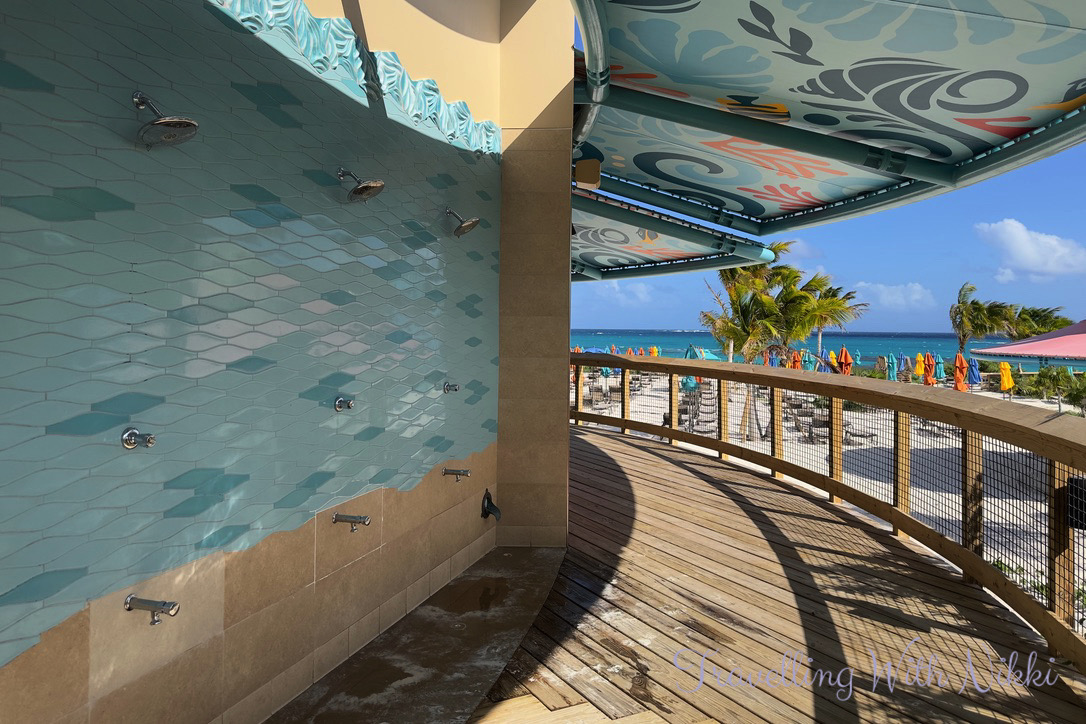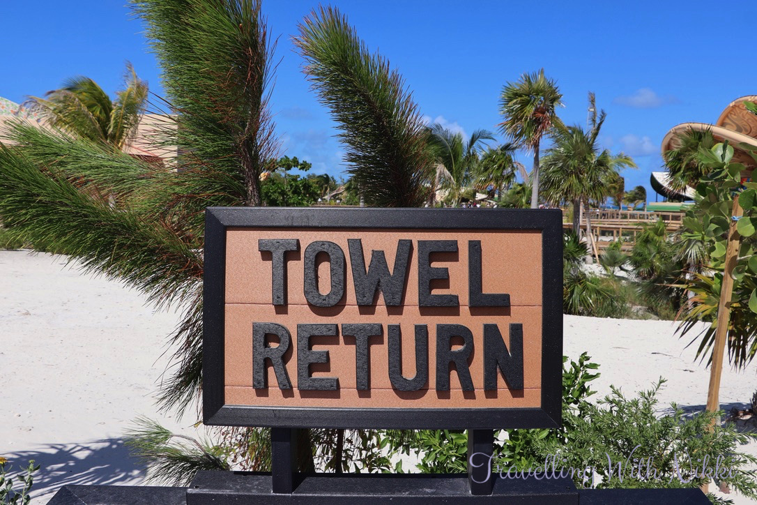 There are showers to rinse off the sand and salt water as well as toilets are located behind all of the four main bars along the Lighthouse Beach and there are also towel return bins which are located throughout the property so you do not need to carry your towels all the way back to the ship.