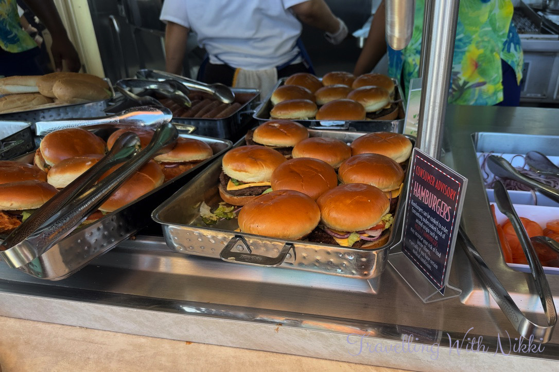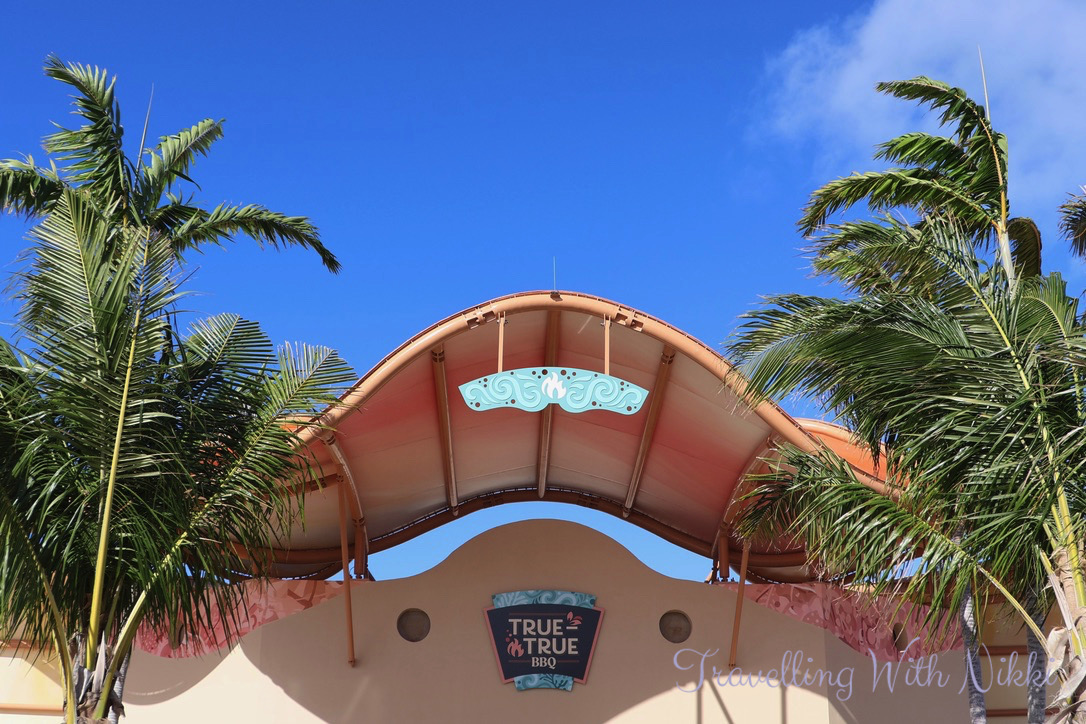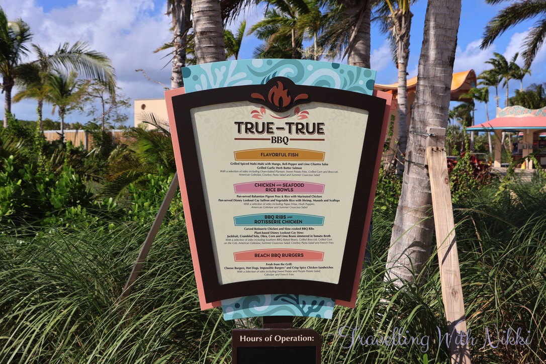 Lunch on Lookout Cay at Lighthouse Point is served between 11:30am and 2:00pm at True-True BBQ, True-True Too BBQ and Serenity Bay BBQ. We got there just before 12:30pm and there was a small line to get a tray for lunch but as it was all of the crews very first time working at Lookout Cay, we expected it to be a little slower than what we are used to at Castaway Cay.