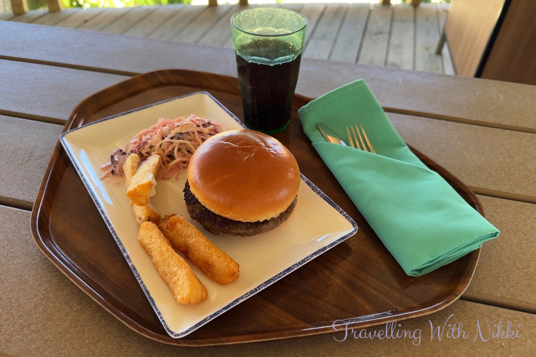 The food quality however was so much better than at Castaway Cay (where we prefer eating lunch back on the ship) and there were so many choices for lunch when we visited including so many different veggie and plant based options and I loved the fact that I could get an Impossible Burger without having to pre-order the night before like I have to on Castaway Cay. Along with my burger I also got some Yucca Fries and Coleslaw along with a Fuze Iced Tea which I love and had missed drinking for the past two weeks onboard as it was not available.