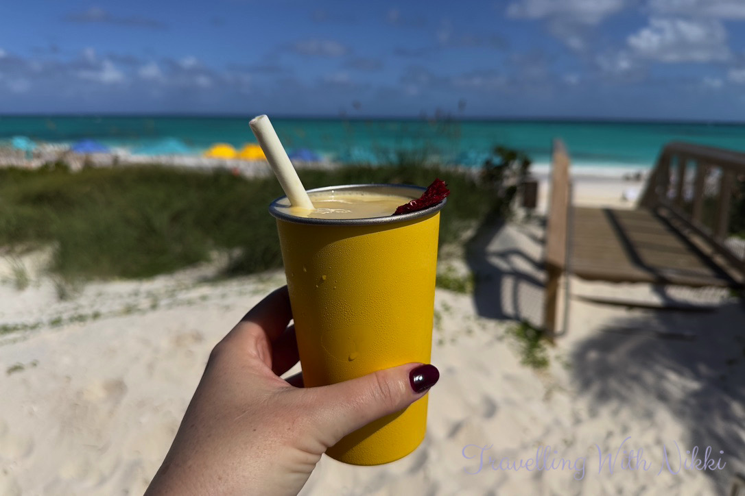 On my way back I stopped at the Bow and Ribbon Bar to get an Eleuthera Euphoria which is the signature cocktail of Lookout Cay and is made with Goslings Spirited Seas Ocean Aged Rum and Pineapple Dole Whip. I then walked back to Sandsational Smoothies to meet back up with my boyfriend who had ordered a Mango Float which is made with Mango Dole Whip, Coconut Milk, Pineapple Juice and Mango Pearls. Both drinks were absolutely delicious and the perfect alcoholic and non-alcoholic drinks to enjoy on a very hot and sunny day.
