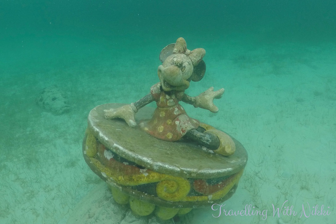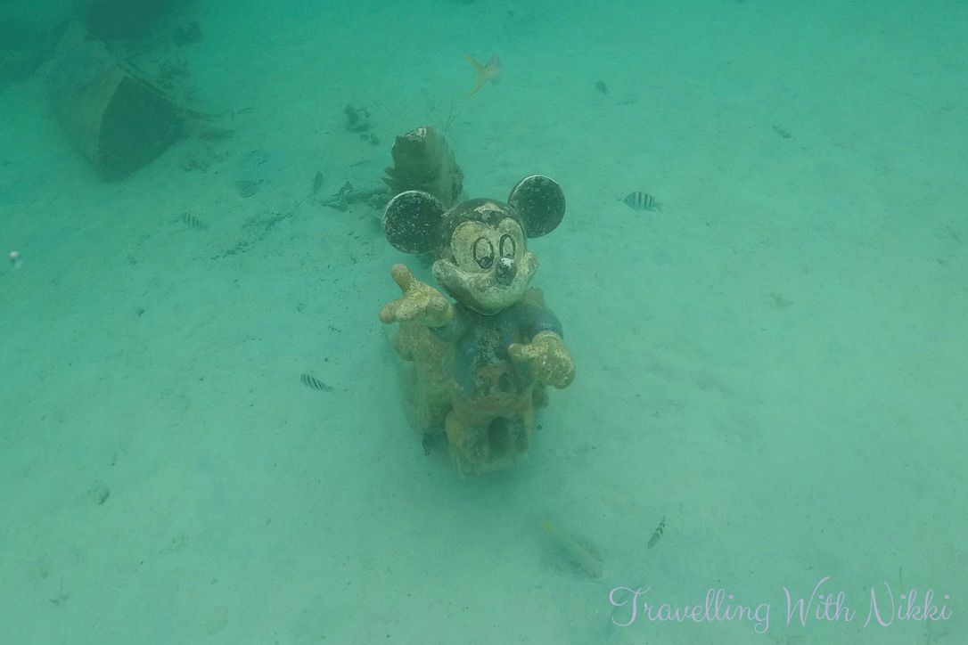 Unlike my previous time snorkelling, I was aware this time of actually how big the lagoon is – it’s a lot bigger than it looks so I was prepared for how far out you need to swim. However I had forgotten how exhausting it is to swim against the current to get out that far into the lagoon. I also remembered how useless the mask and snorkel I had were as they both constantly let in water and the mask did not stop fogging up the entire time I was in the water. However I quickly found the Minnie Mouse statue underwater as I remembered where she was located before swimming even further out to find Mickey.
