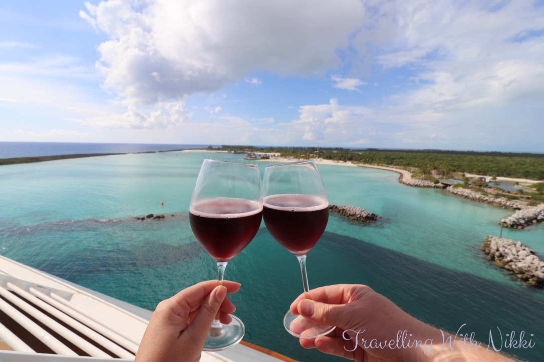 We were back in our stateroom at 3:45pm which was an hour before the all aboard time. As I was hungry after not having much for lunch, we decided to get some food from Deck 11 and I had a veggie hot dog (made with a Beyond Meat sausage ) and fries – it tasted so good and was so much better than the veggie burgers onboard and at Castaway Cay. We ate our food on our verandah and also finished the last of the Rosa Regale that we had brought onboard with us whilst enjoying a perfect view of Castaway Cay.