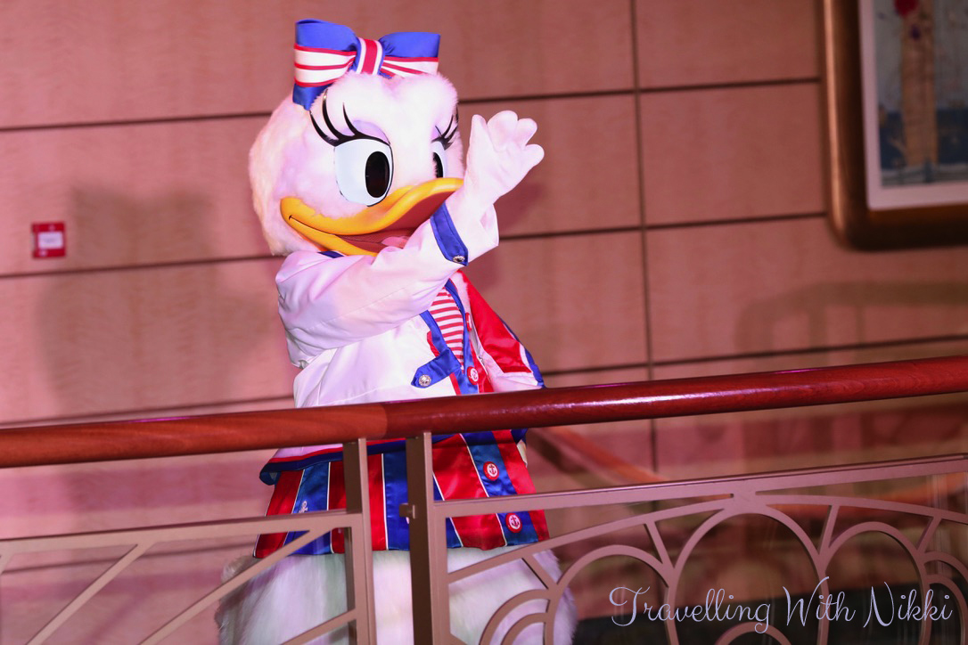 After fifteen minutes, the It’s a Good Time (Get Your Ears On) music started and the characters all assembled together on the Deck 4 balcony for a photo opportunity for everyone in the lobby. Between the two of us, we managed to get some great photos but I’m not sure why we saw this and not See Ya Real Soon but I know from reading Personal Navigators for cruises in the weeks after our sailing, that they have done both on the last day.
