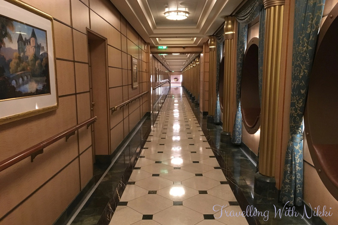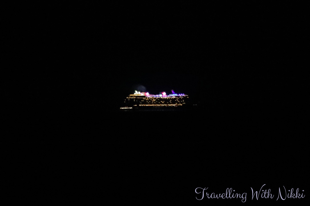 We then walked back down to the lobby atrium to get a last few photos as it was now also empty. On the way back to our stateroom, we walked outside onto Deck 4 when we saw the Disney Dream sailing past us in the distance on her way to Nassau. We tried to get a picture but it’s very difficult to take a photo of a moving ship from another moving ship at night!