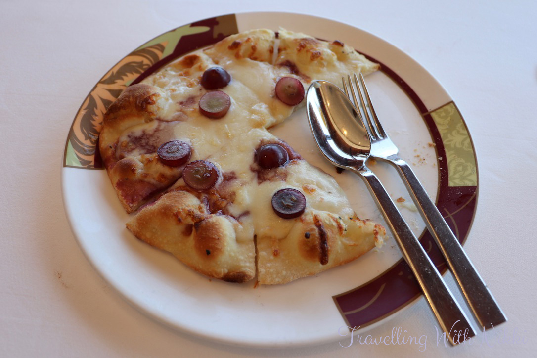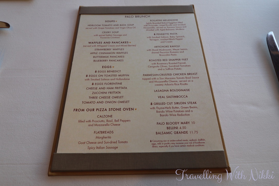 Carole brought us both a glass of water with lemon before offering us a complimentary Prosecco, Mimosa or Kir Royale. The Palo brunch menu had not changed since our previous visit and I was once again incredibly happy that they can still make the amazing Grape and Gorgonzola Pizza that was one of the most popular items they served until they took it off the menu. My boyfriend ordered the Lasagne Bolognaise and after loving the Artichoke Ravioli so much on my last cruise, I knew that I had to order that as well as the pizza to share between us.