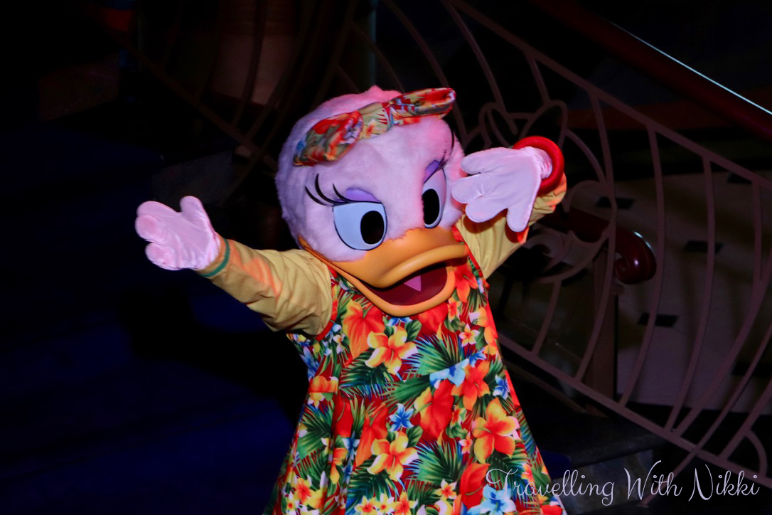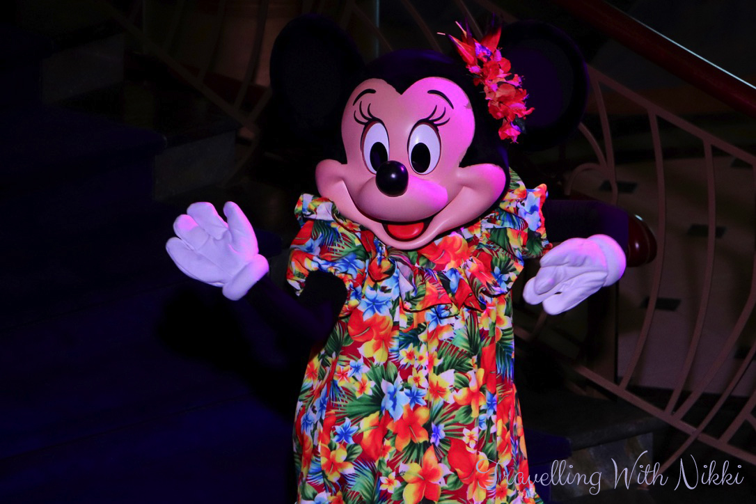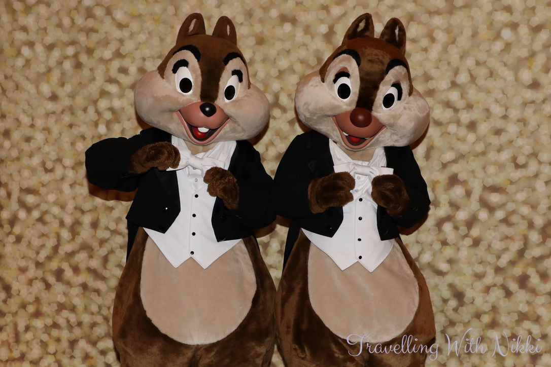 As it was semi-formal night, the characters were wearing the same costumes as they had been on formal night earlier in the cruise and we noticed that Chip and Dale were going to be meeting in the lobby atrium at 7:45pm. As we had not yet met either of them on this cruise (they had not been out much at all), we got in line a few minutes early which I’m glad we did as the line got extremely long. This was one of the only busy lines that we waited in for the entire cruise but I did not mind as meeting Chip and Dale is always such fun no matter where you are in the world.
