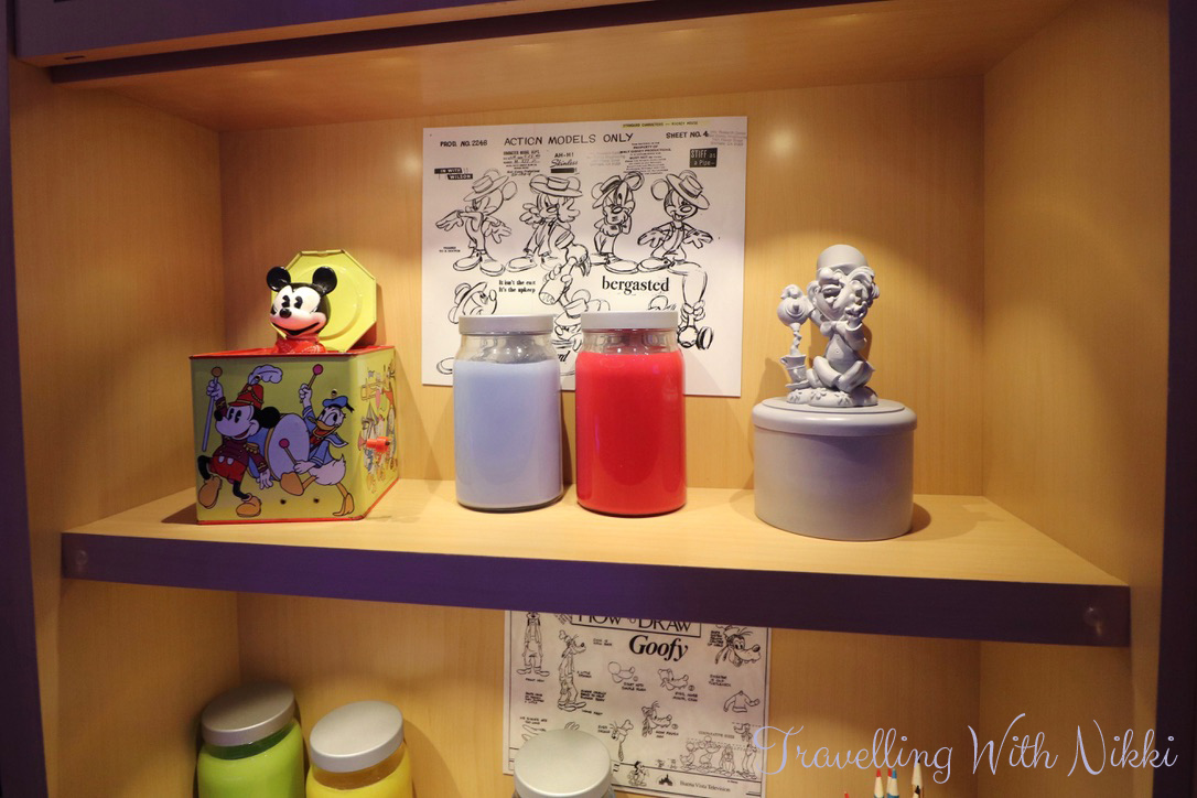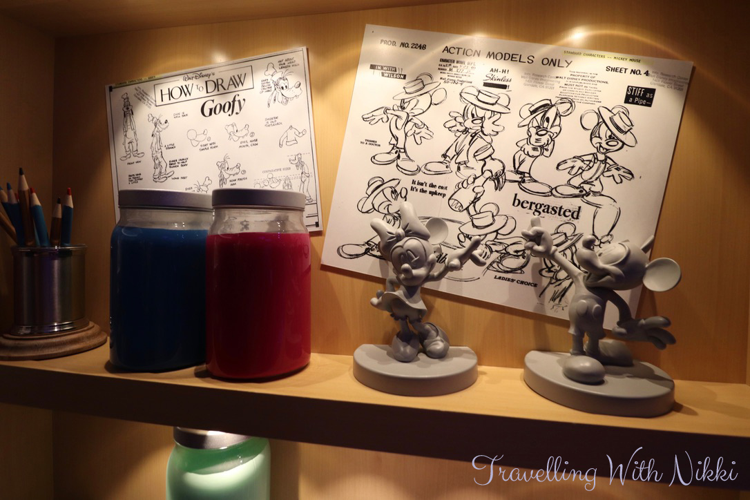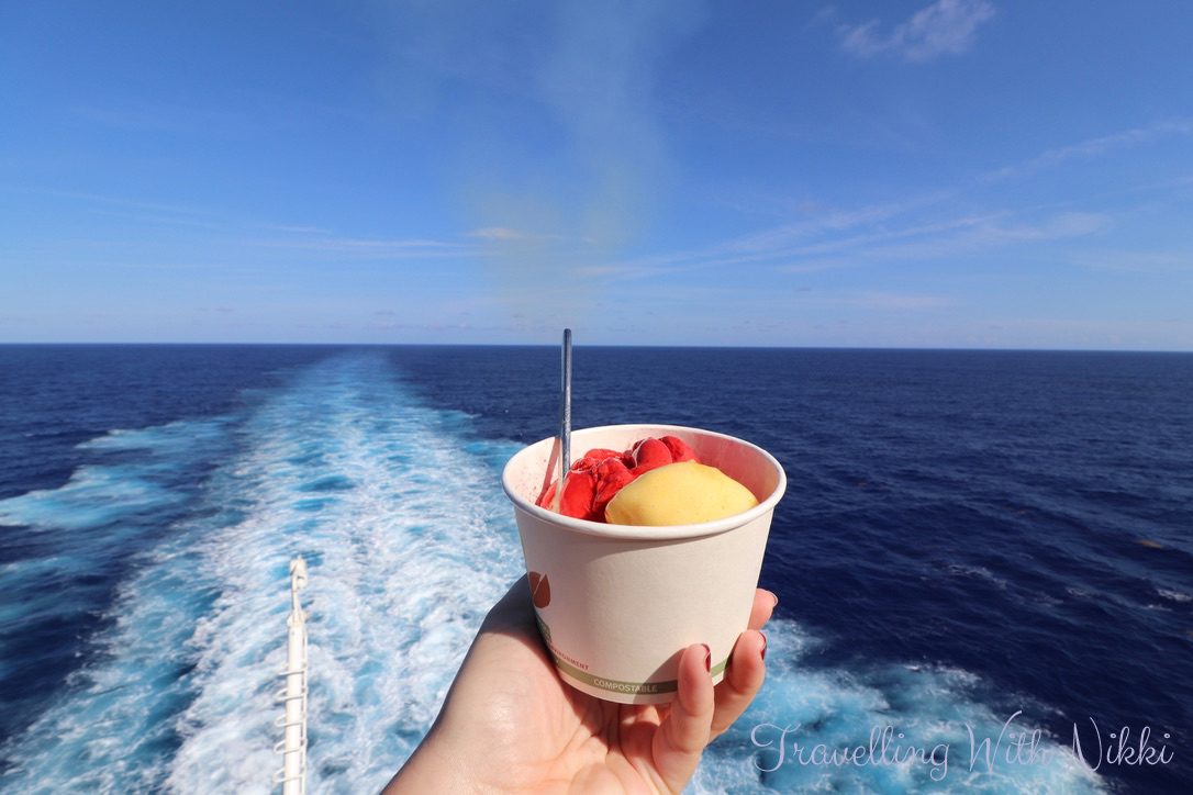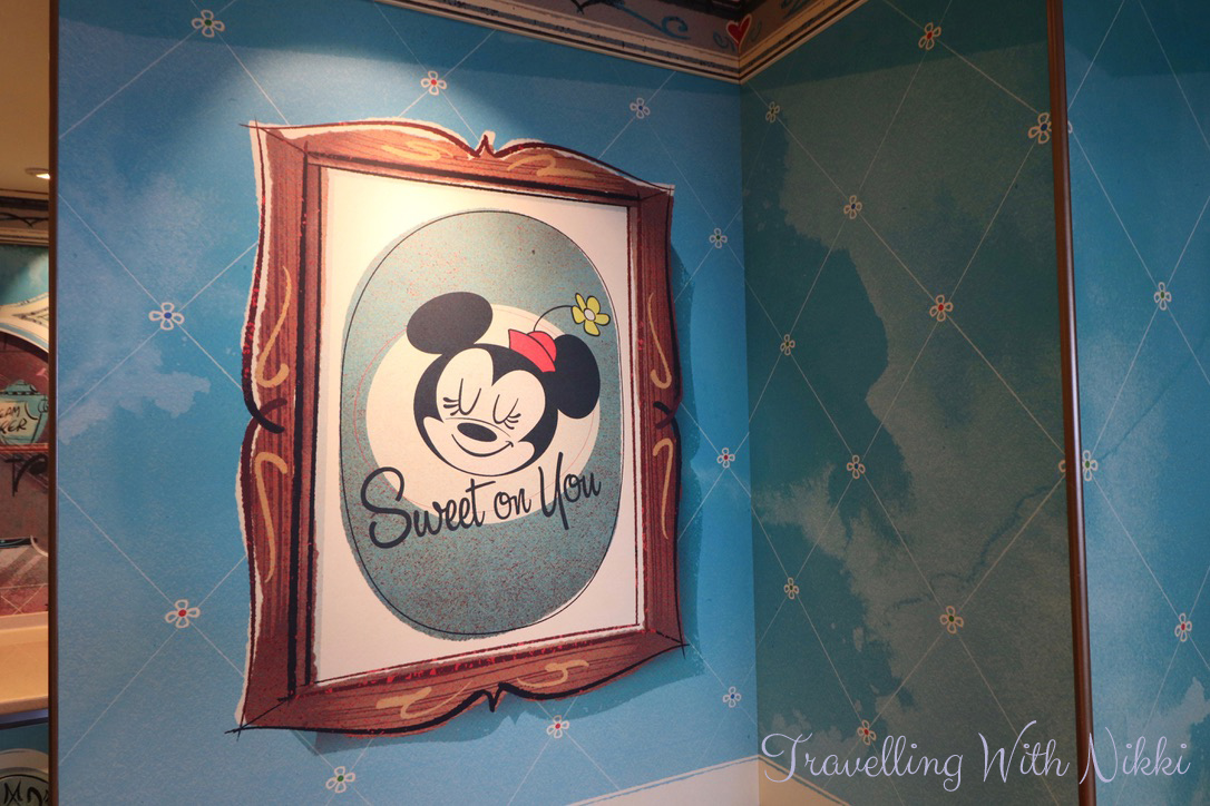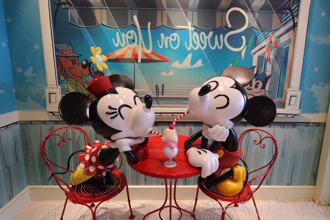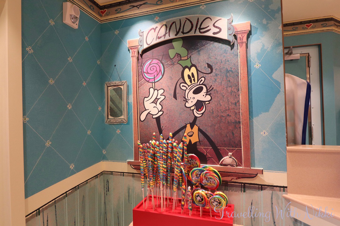 One of the things we knew we had to do on this cruise was to visit Sweet on You so we took the elevator up to Deck 11 after meeting Goofy. You can sample any of the ice cream and sorbet flavours before you buy and I decided to get both the Mango as well as the Raspberry Sorbet. I paid $5 for two scoops in a bowl and both were absolutely delicious and completely worth the upcharge. I also loved the decor inside Sweet on You especially Mickey and Minnie sharing an ice cream at the table by the window.