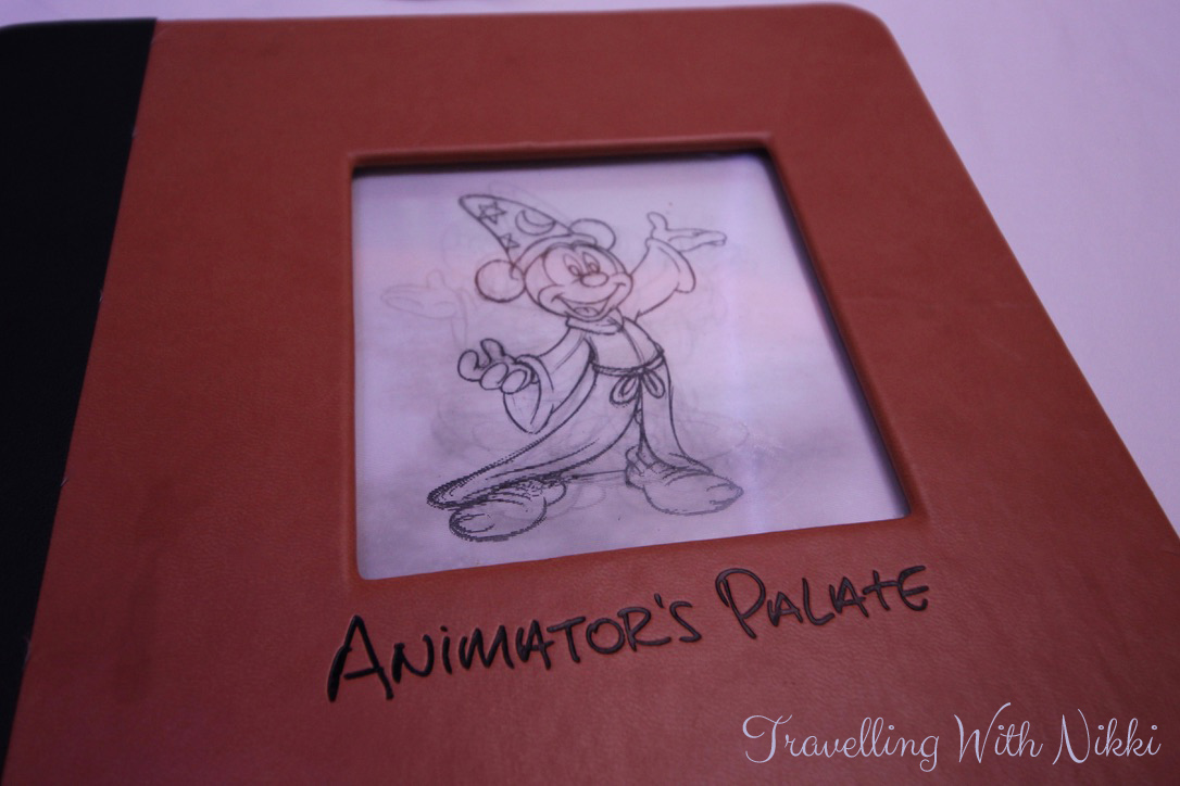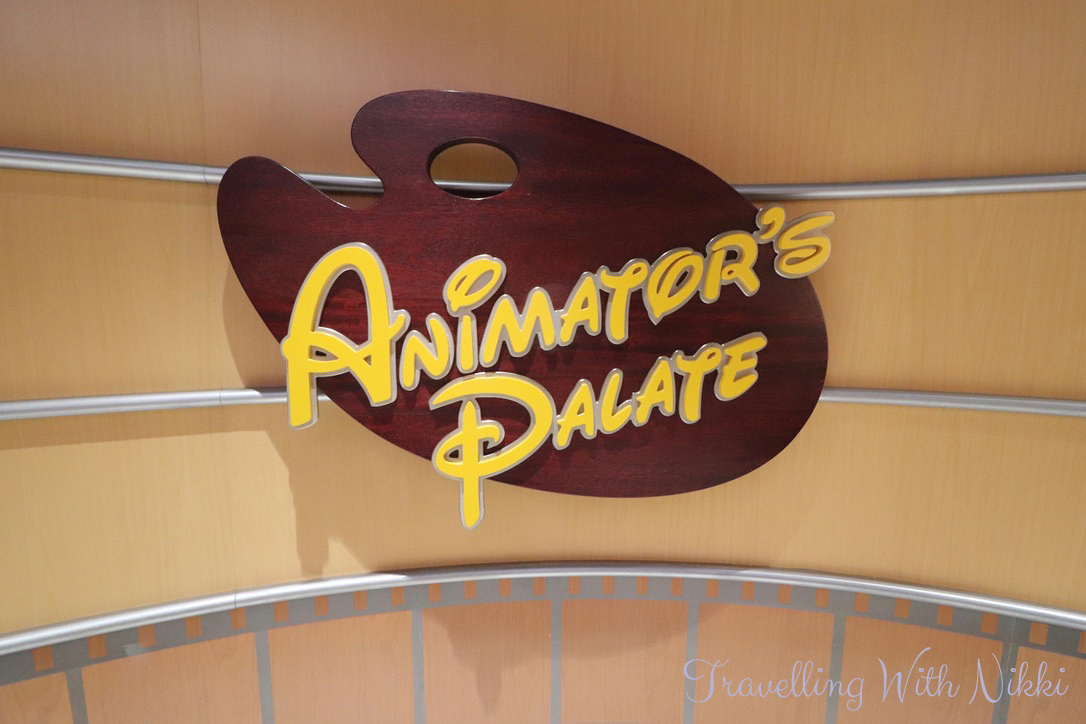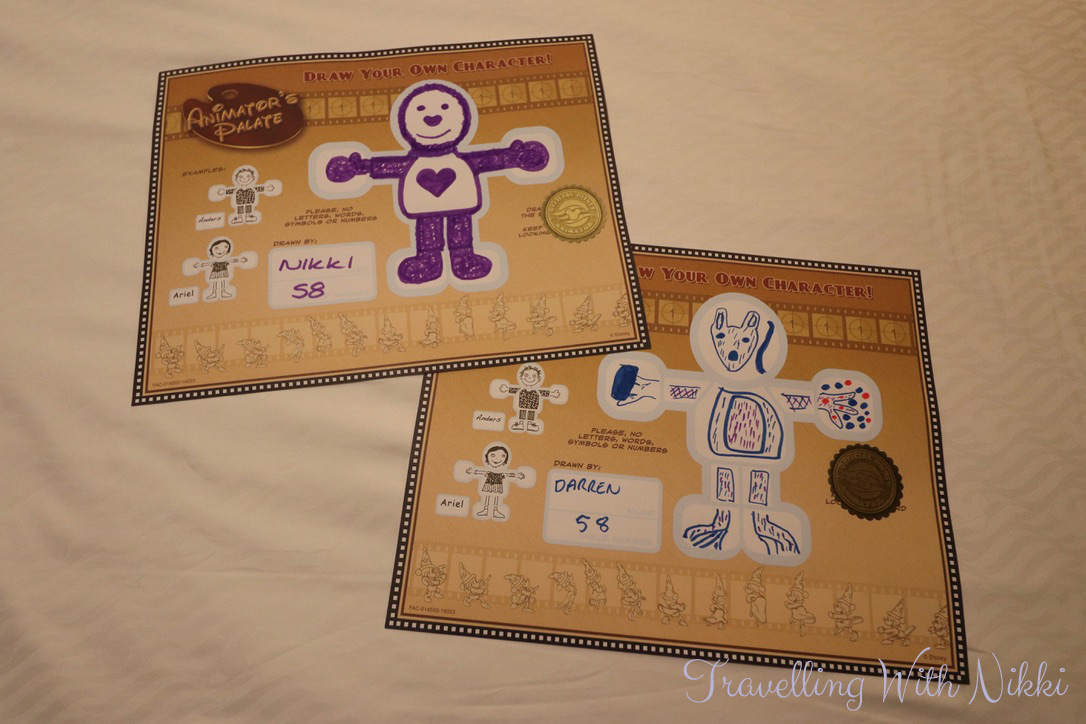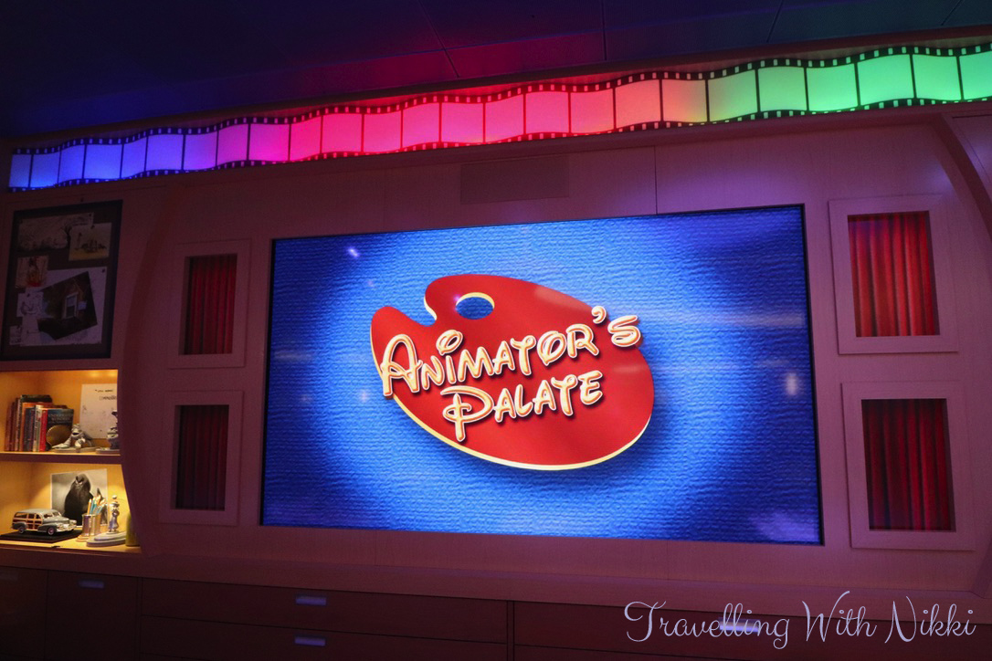 After meeting Chip and Dale, we walked to Animator’s Palate for dinner which I had been looking forward to for the whole cruise at it was Animation Magic night. As suggested by both Xavier and Tanya the evening before, we got there a few minutes early so we had extra time to draw our characters before having dinner. As this was the first time we had dined in Animator’s Palate on this cruise (we had dinner in Remy on the first night we would have dined in there), we had no idea where our table was located in the restaurant. Both of us were completely gobsmacked when we were shown to our table which was located right in front of one of the giant screens as we would have a perfect view of the show. It would also have been a perfect table for the Turtle Talk with Crush show if we had dined there earlier in the cruise.