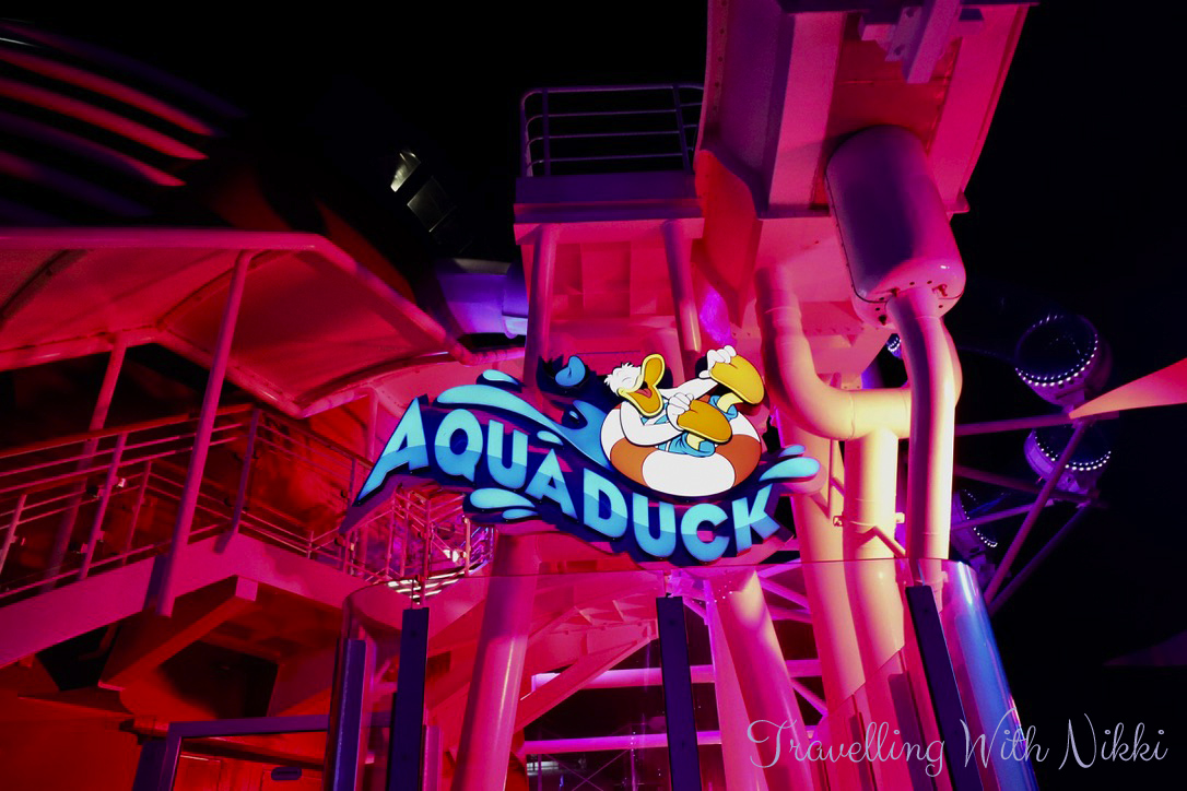 Our main goal on this night was to ride the Aquaduck after dinner as it was open most evenings on this cruise until 11:00pm. It was also extremely quiet at this time and I think we rode it three or four times in a row each with very little wait. It was just as much fun riding it in the dark and I loved all the disco lights all the way around.