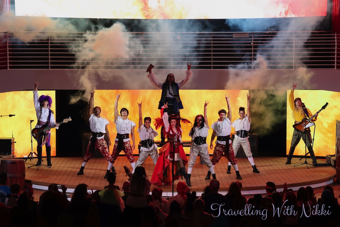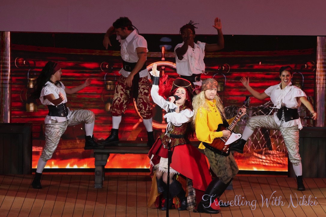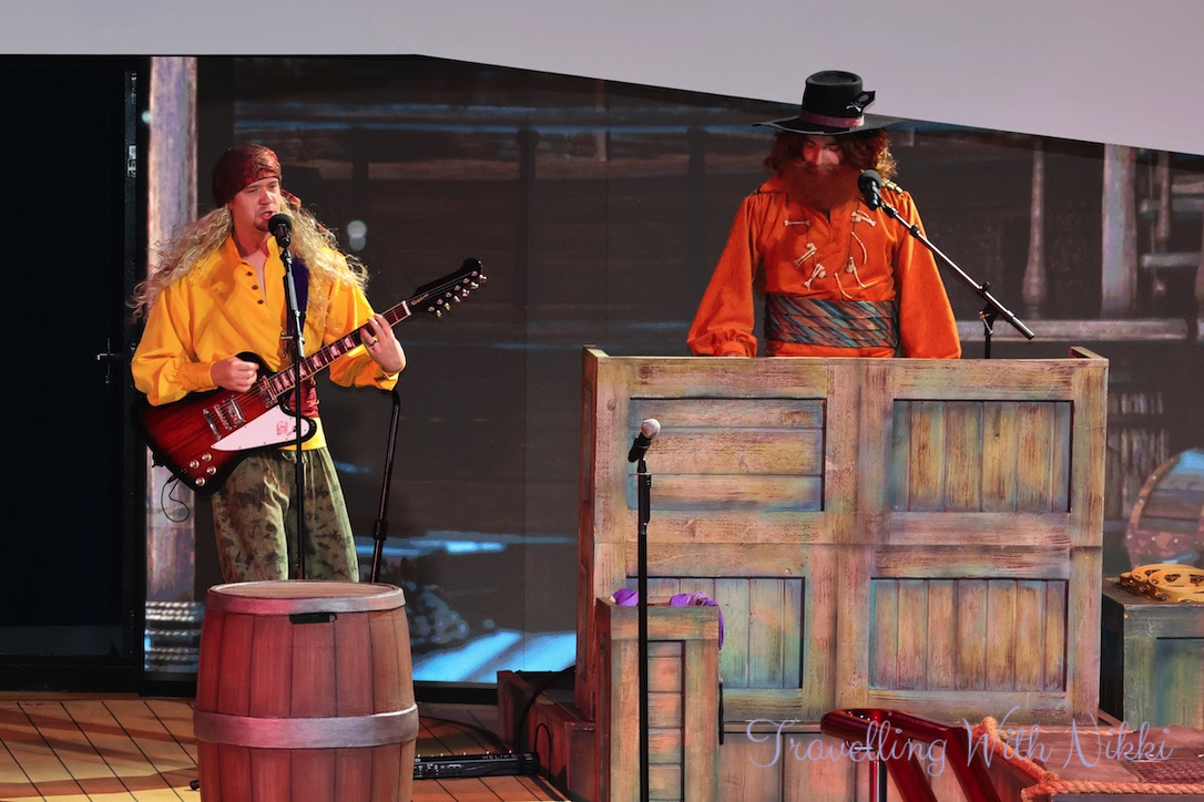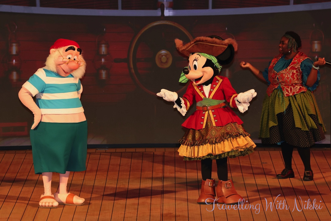 Mickey and Minnie’s Pirates in the Caribbean is the exact same show that is on the Disney Wish and almost the same show to what is onboard the Disney Dream and Disney Fantasy although a little shorter with a few small changes throughout. As part of their Pirate Academy, the deck party begins with Pirate Donald, Pirate Daisy, Pirate Goofy as well as Captains Mickey and Minnie teaching everyone the four different lessons of what it will take to become a member of their pirate crew.