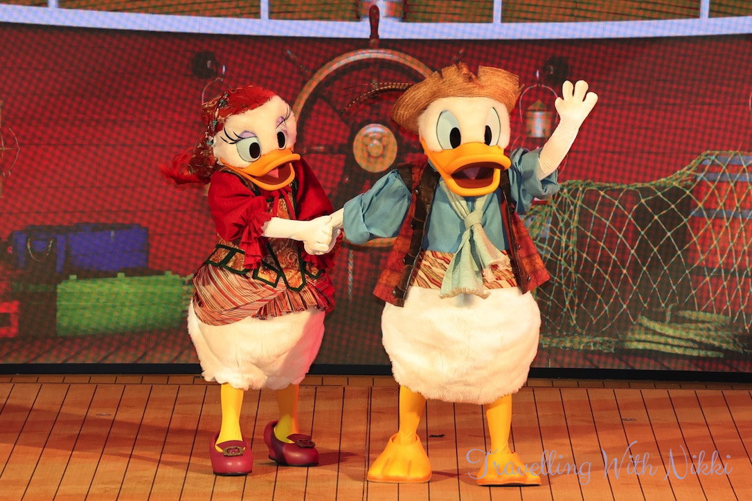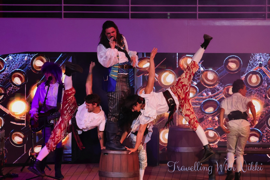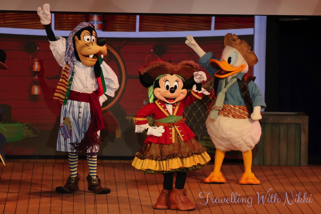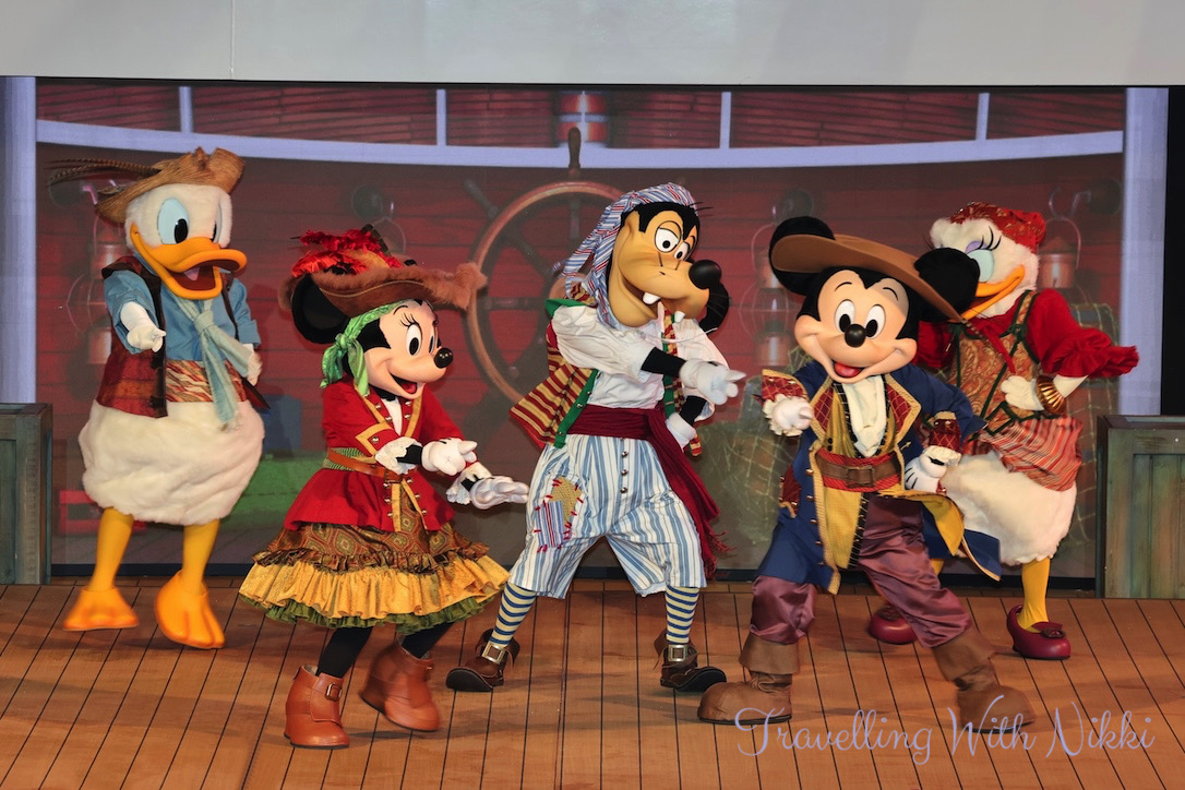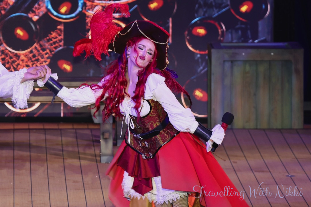 Mickey and Minnie’s Pirates in the Caribbean is the exact same show that is on the Disney Wish and almost the same show to what is onboard the Disney Dream and Disney Fantasy although a little shorter with a few small changes throughout. As part of their Pirate Academy, the deck party begins with Pirate Donald, Pirate Daisy, Pirate Goofy as well as Captains Mickey and Minnie teaching everyone the four different lessons of what it will take to become a member of their pirate crew.