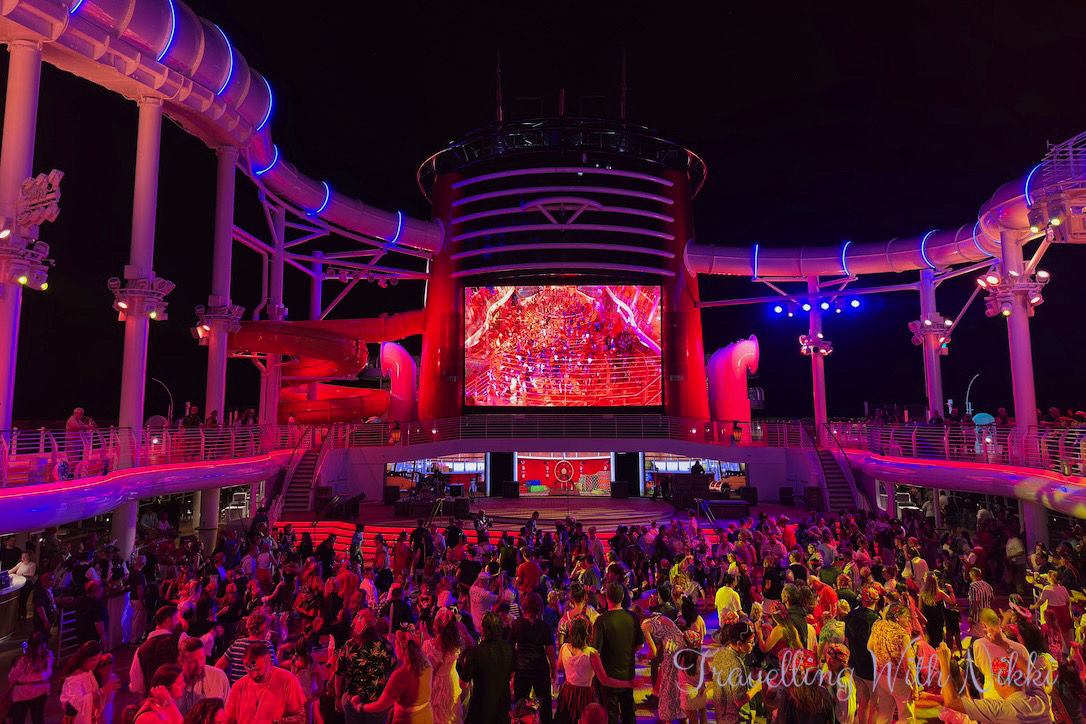 We always tend to stand in the exact same place for the deck parties onboard which is on Deck 12 close to the side of the stage however on this cruise we decided to change things up just slightly. We stayed on Deck 12 but moved further back to a spot that was directly facing the front of stage. It was a little further away to what we were used to but with a good camera lens it worked perfectly and it was really fun to see the show from a different angle for the first time ever.