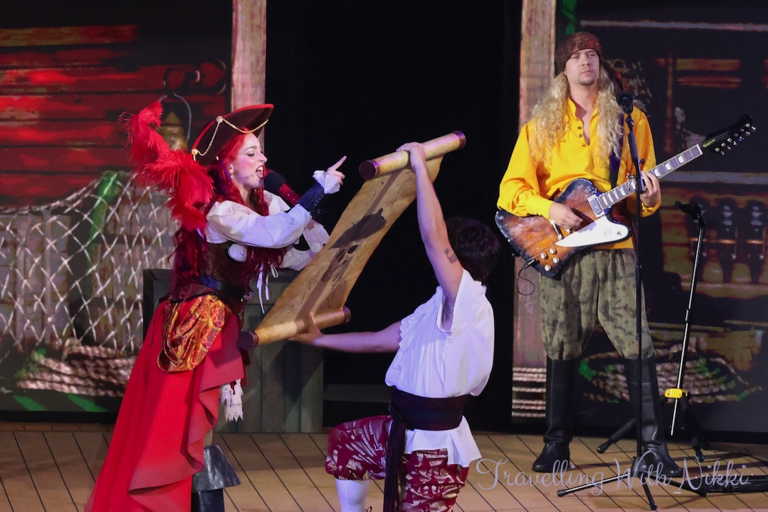 Sir Locksley then introduced Captain Redd who sang We’re Not Gonna Take It by Twisted Sister before telling everyone that she had won the ship from Captain Jack Sparrow. However whilst looking below deck, she found a scroll hidden inside a bottle (but it was not a rum bottle as Jack would have found that himself) which talked about a sparkling treasure and said: