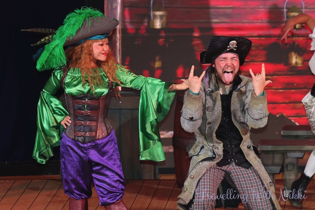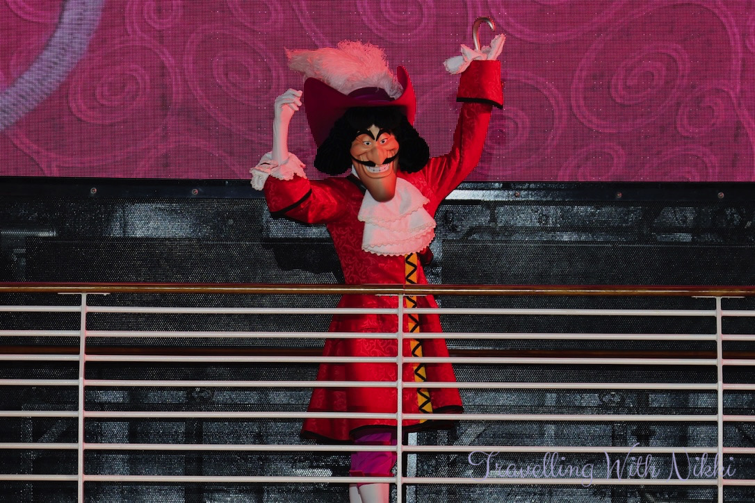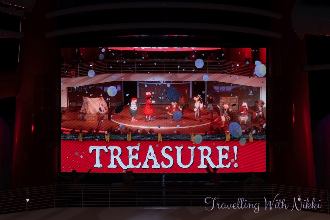 Captain Hook and Mr Smee arrive not long afterwards to take over the ship so Captain Mickey challenges Hook to a “Captain’s Challenge” to win the Disney Treasure back. If Hook wins, Mickey has to walk the plank and if Mickey wins, he gets the ship back and Hook and Smee have to leave. I know I said it when we sailed on the Disney Wish but I really wish that they had changed this part of the show to have Captain Minnie challenging Captain Hook to the Captain’s Challenge as she is a captain now and it would be amazing and so much fun to see!