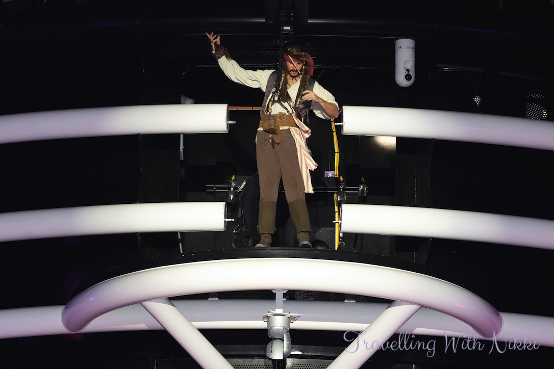The Disney Treasure was certainly the most rocking ship in the Caribbean when Captain Mad Bart and Captain Shackleward (aka Coriander and Sage) arrived followed shortly afterwards by Captain Jack Sparrow who quite literally dropped in. The four Captains placed their hands on the scroll and yelled out “Yo Ho” and the sparkling treasure was revealed to be the fireworks which were launched from the starboard side of the ship as the band continued to play a brilliant mash-up of the Pirates in the Caribbean soundtrack and Yo Ho (A Pirate’s Life for Me).