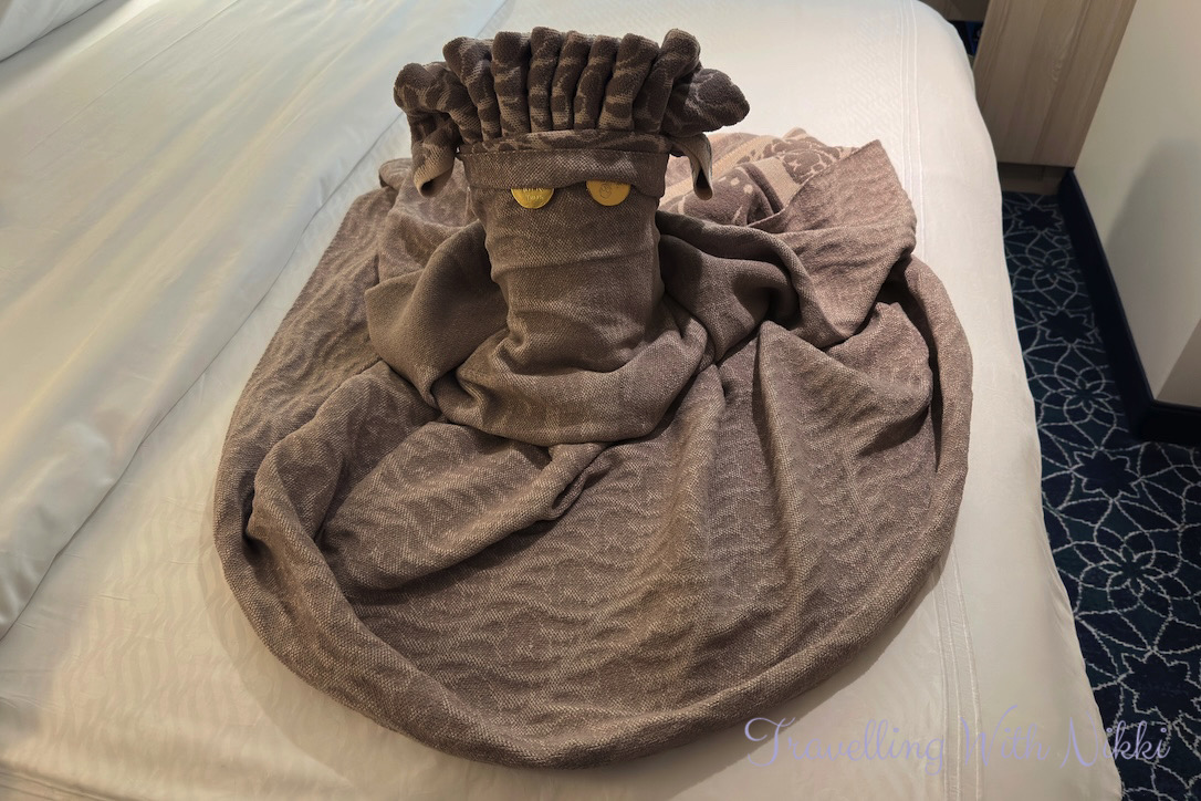 When we finally got back to our stateroom, a blanket Davy Jones was waiting on the bed complete with some chocolate coins for eyes and it was only then that we realised that this was the first time we had been left some chocolates in the evening on this cruise – there was no sign of the normal turndown chocolates on any other night.