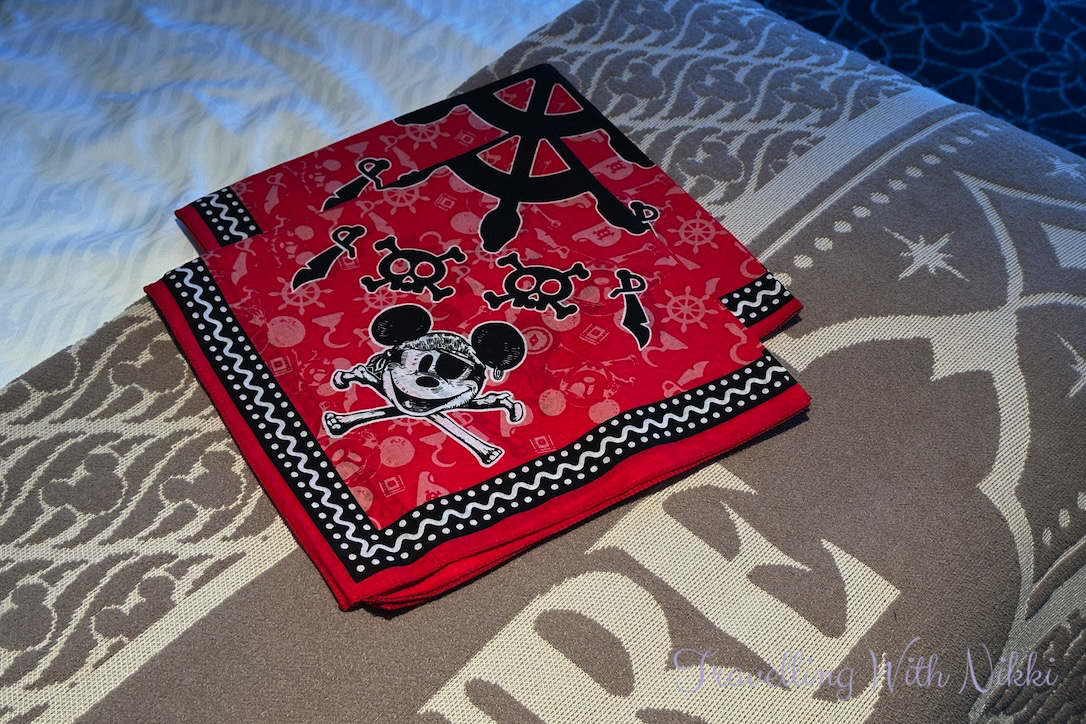 We were back onboard the Disney Treasure just before 4:20pm and we headed straight up to our stateroom where two of the brand new (we have only ever received the old style ones on our previous cruises) bandanas ready for Pirate Night were waiting on the bed for us.