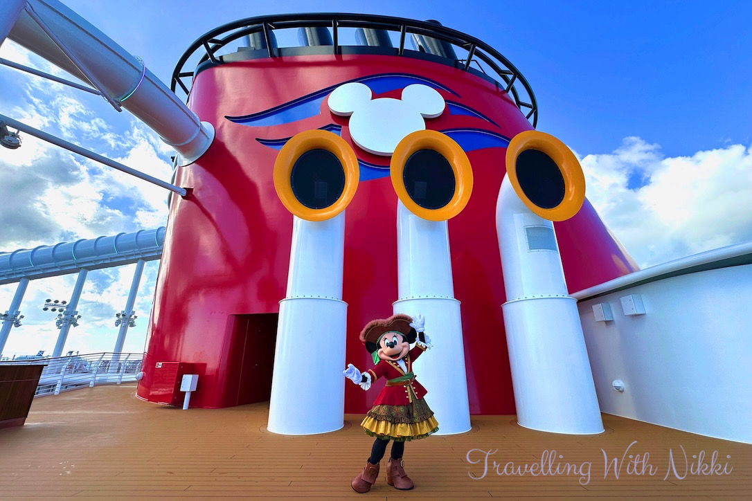 Once we got changed, we took the elevator up to Deck 13 where we joined a short line to ride the “Curse of the Golden Egg” version of the AquaMouse which is exclusive to the Disney Treasure. However whilst we were waiting I saw Pirate Captain Minnie walking around a near empty Deck 12 so I quickly left the line to go and get her photo and this was another of my favourite memories of the entire cruise – especially when Minnie suggested that I take her photo with the iconic red funnel in the background.