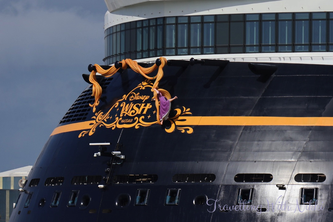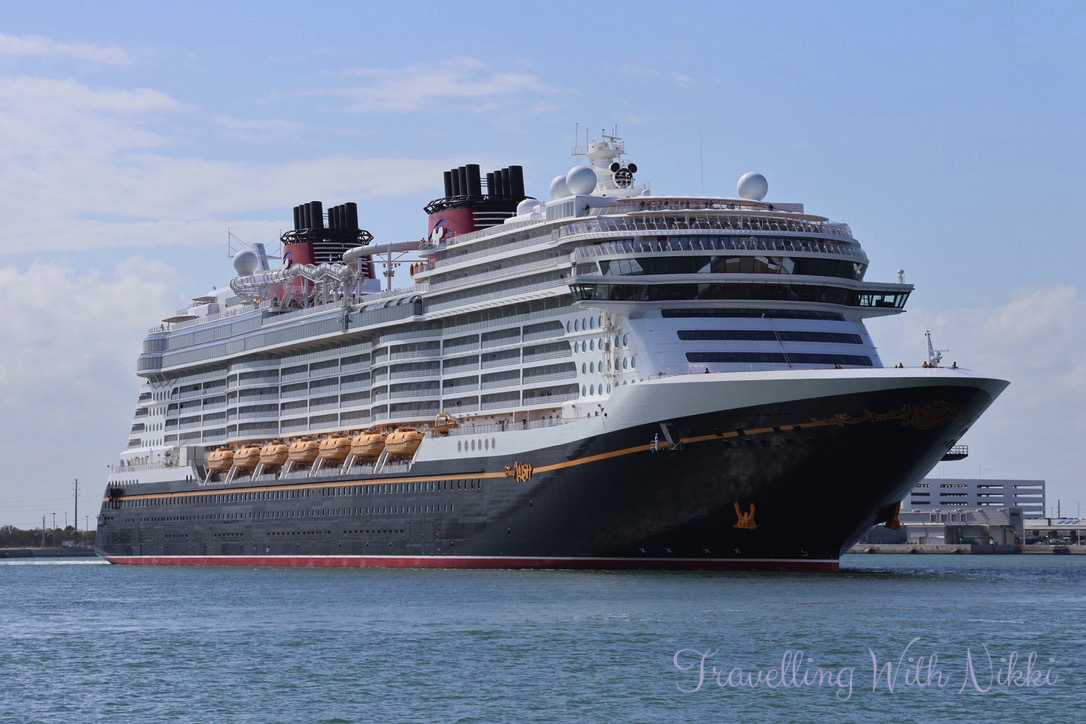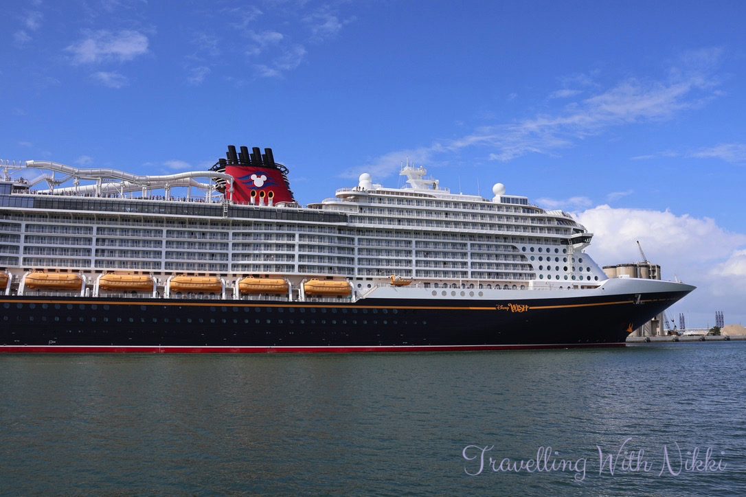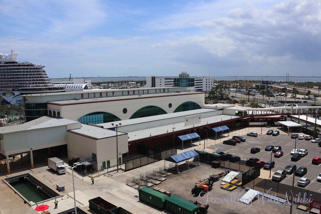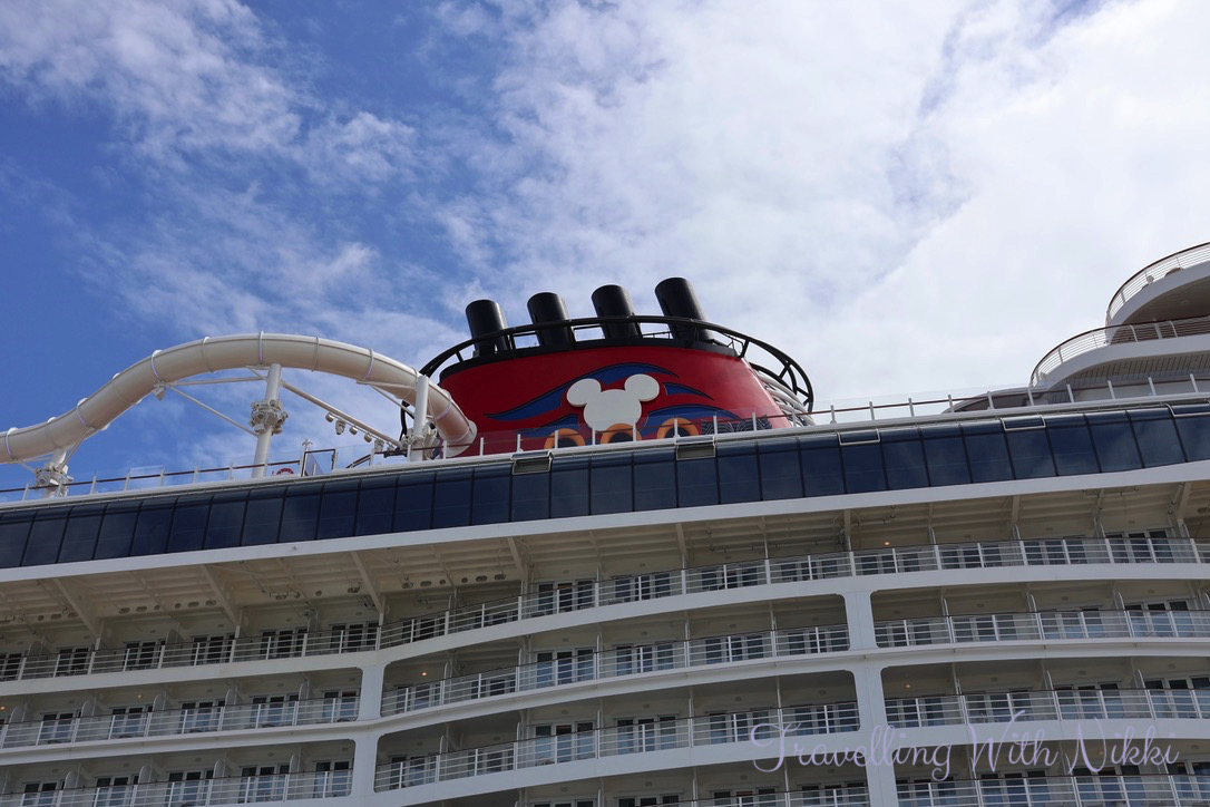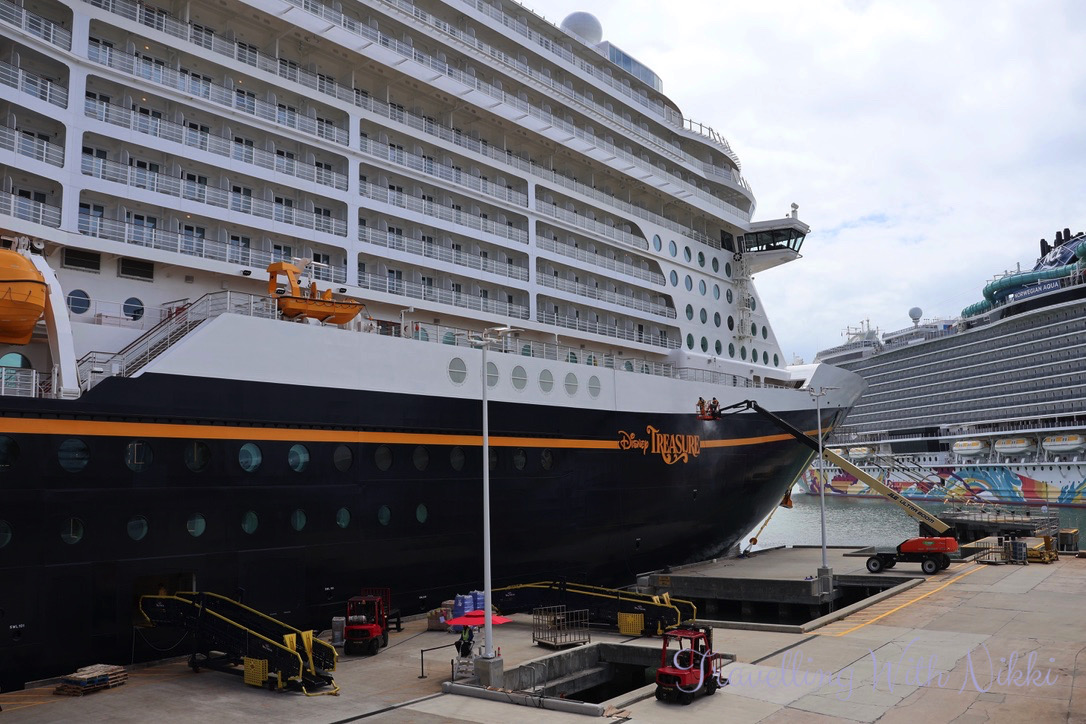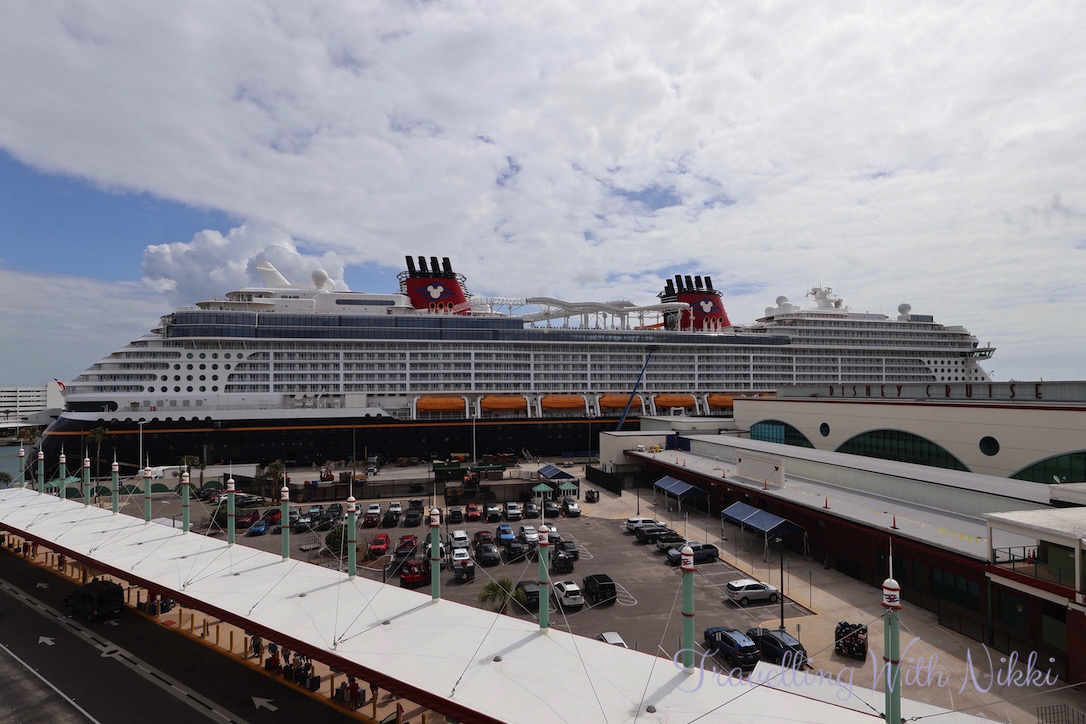 As we had a little bit of time to kill before our Port Arrival Time which was at 11:45am, we took the elevator up to the roof of the parking garage to see the Disney Treasure up close for the very first time. She looked so beautiful (as well as all shiny and new) in the sunshine and it was such an exciting feeling knowing that we would finally be onboard very soon.