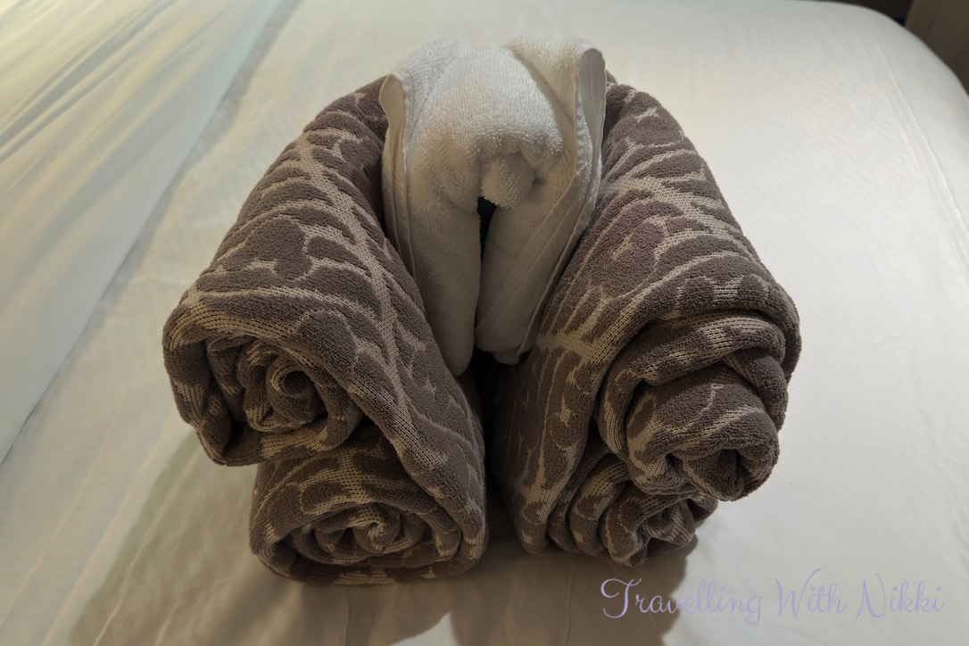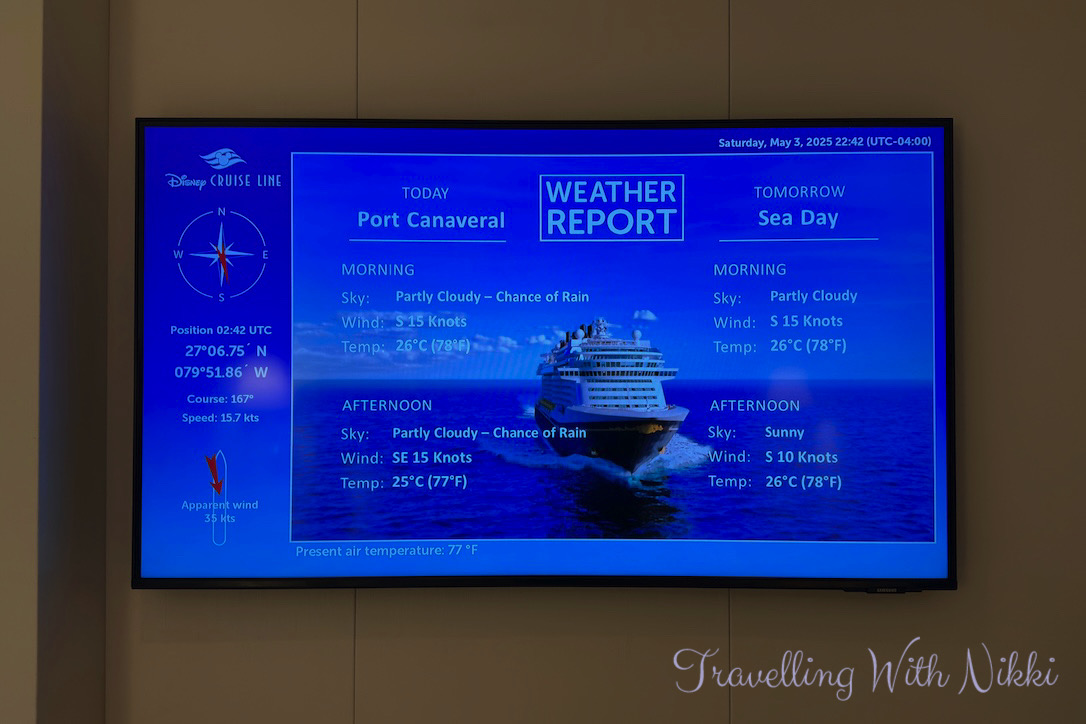 We headed back to our stateroom where our first towel/blanket animal was waiting for us on the bed. One of my favourite features on the Disney Treasure is that the television is located on the wall directly opposite the bed (which I love as it means you can sit in bed without having to crane your neck to the side and squint your eyes further down the room) and I loved sitting in bed at the end of each day watching the Bridge Report channel which was showing that we were currently sailing at a speed of 16 knots close to West Palm Beach.