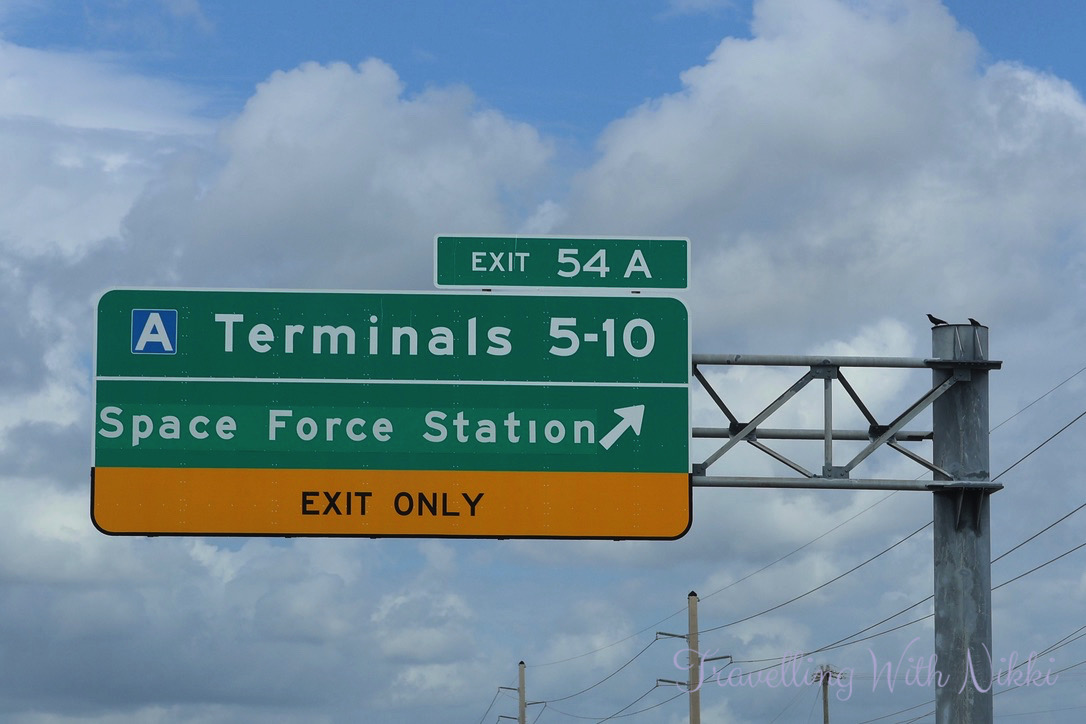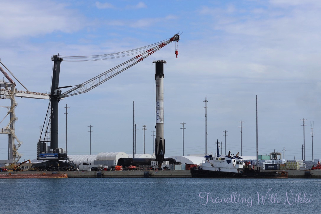As our hotel was located so close to Port Canaveral, we were in no immediate rush that morning so after sitting in bed for a while, we eventually showered and got dressed before attaching the yellow luggage tags to our bags (which had been sent to us a few weeks before the cruise) and we left our hotel room just before 10:30am. Our first stop a few minutes later was back at Port Canaveral Park once again where we could see the Disney Treasure docked across the water at Cruise Terminal 8 as well as a Space X Falcon 9 first stage rocket booster that had launched to space and then landed back to Earth a few days beforehand.